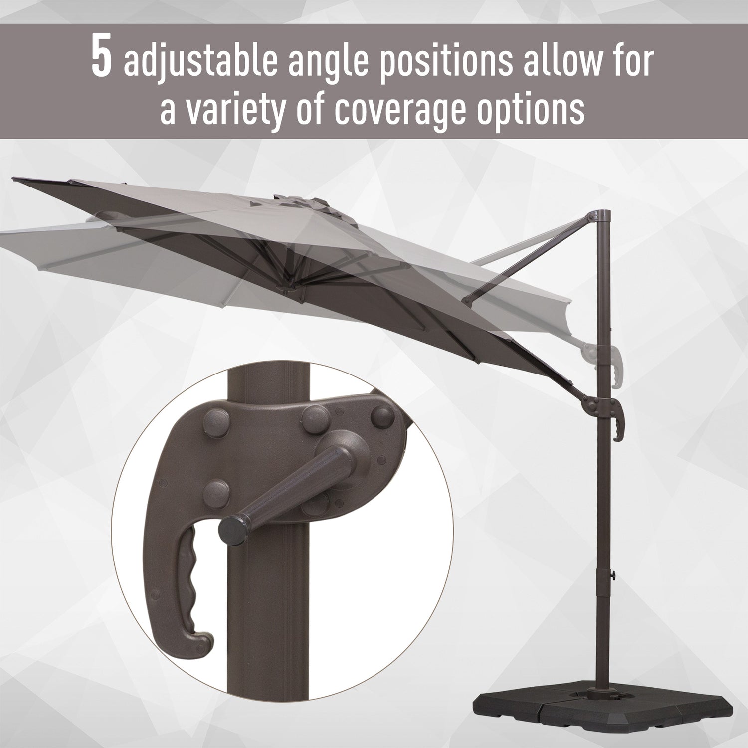 - The cantilever patio parasol rotates 360 degrees and can be tilted to various angles to suit you