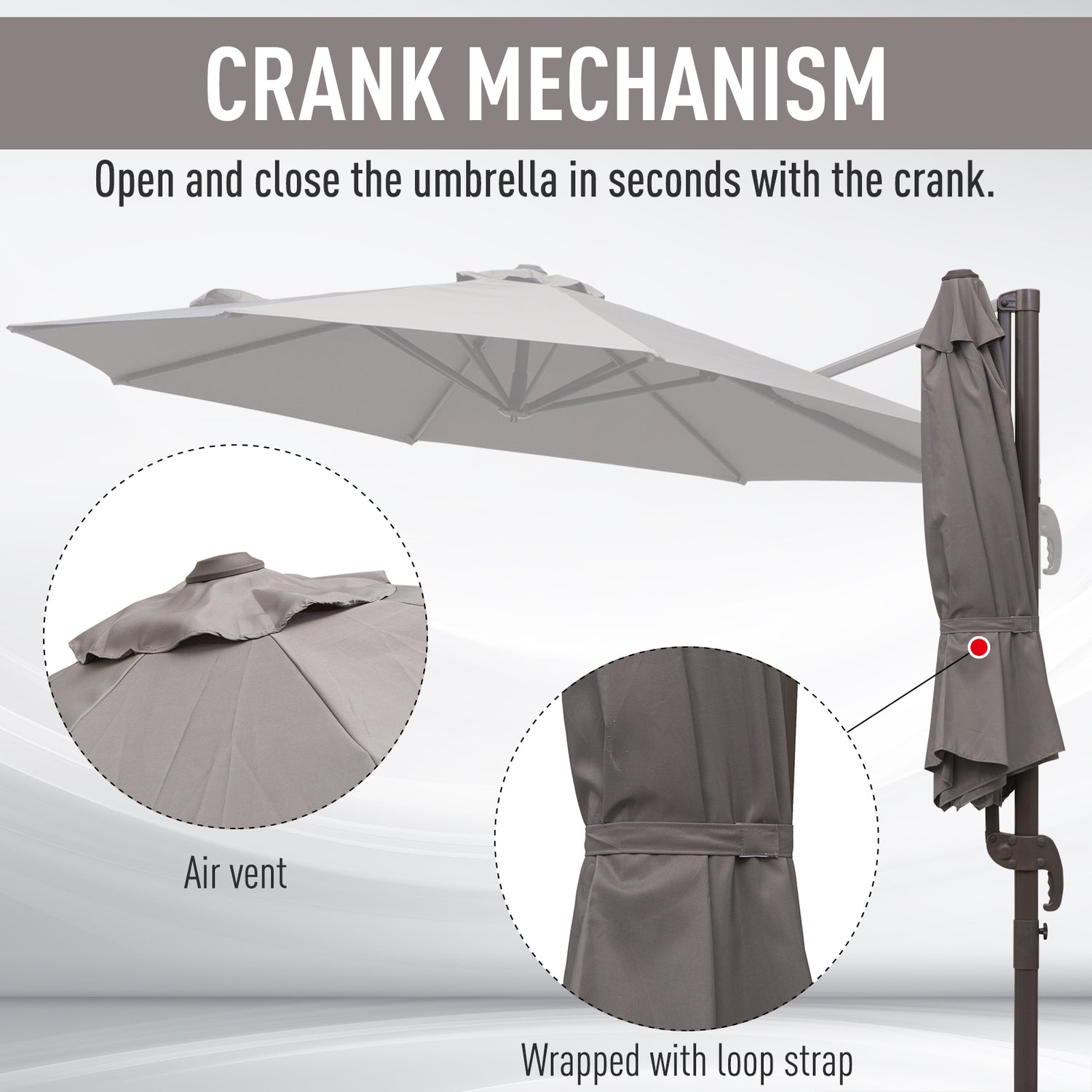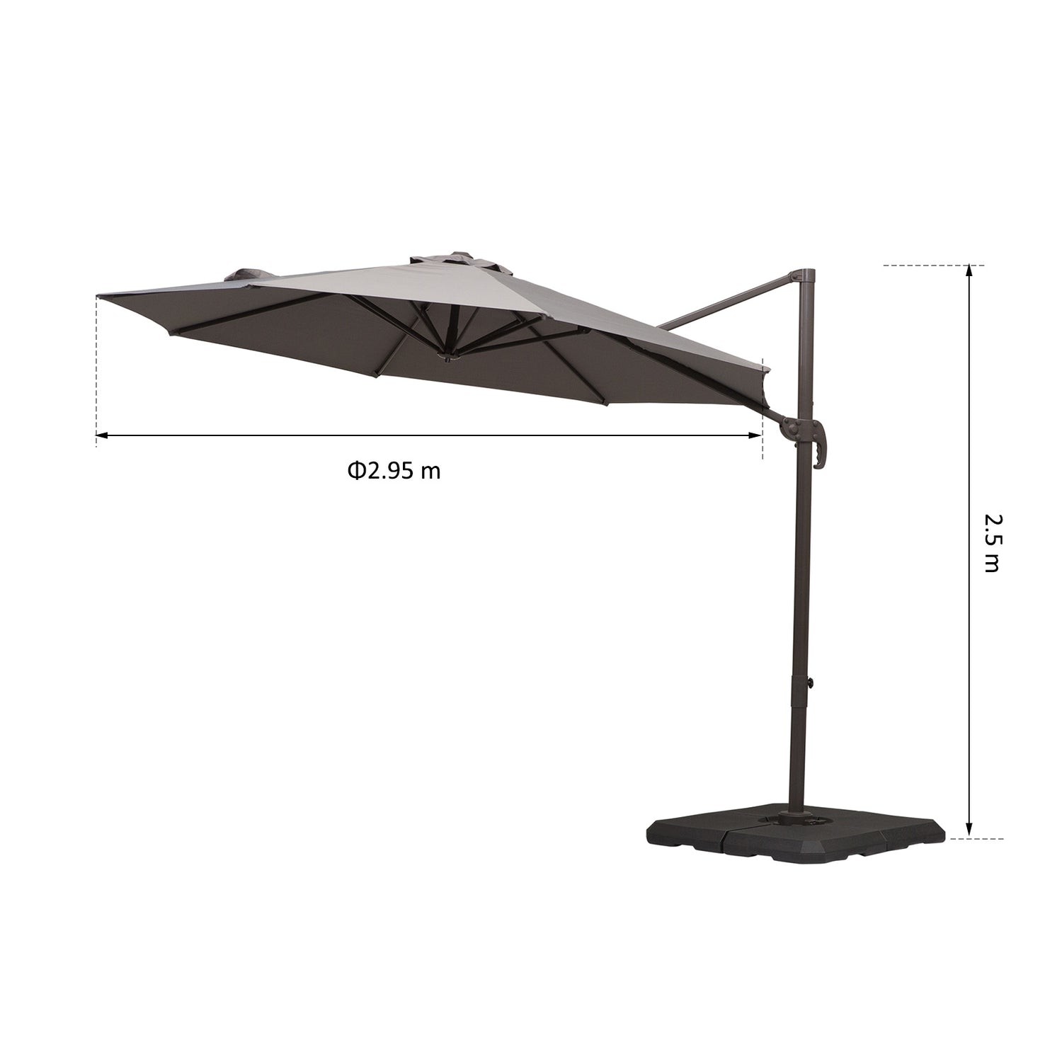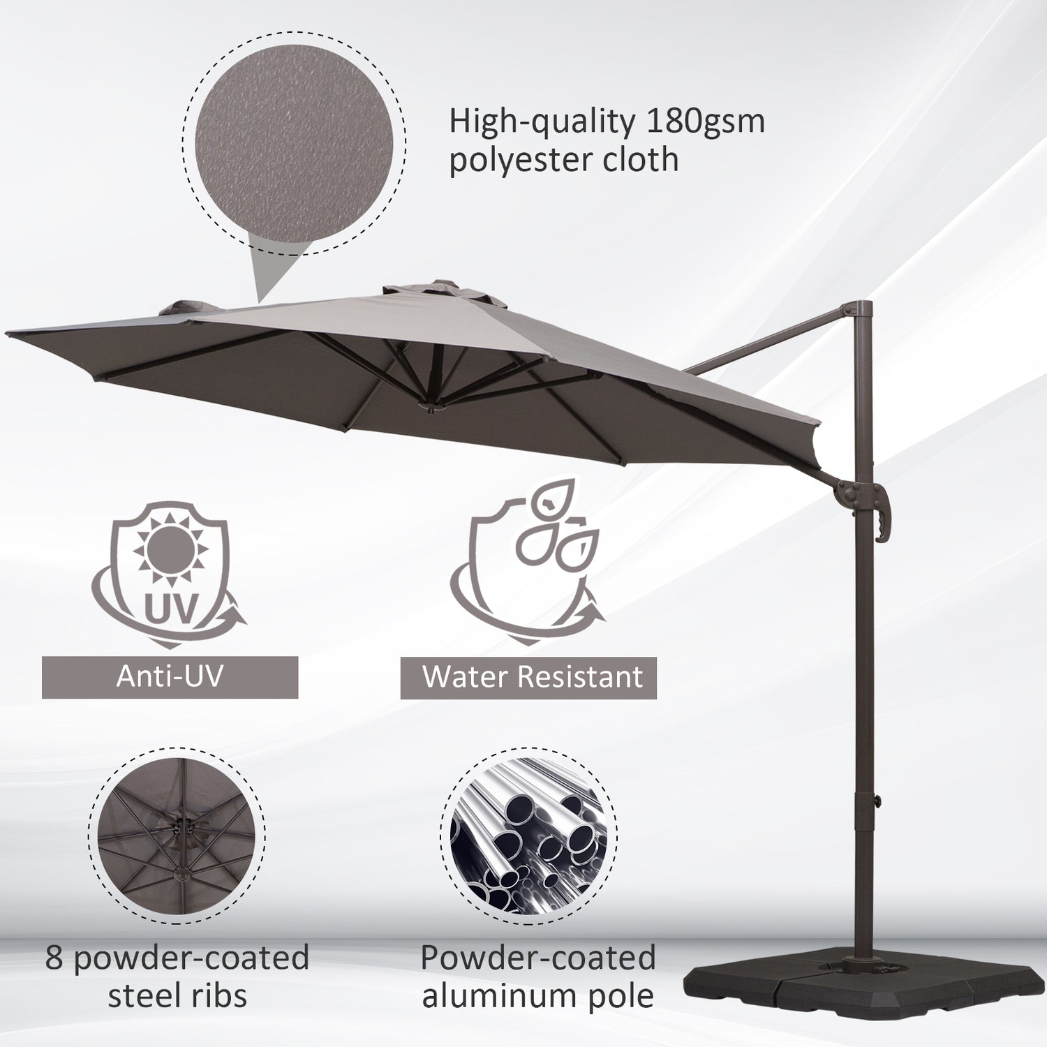 - WEATHER-RESISTANT CANOPY: Made from 180g polyester, the cantilever patio parasol protects you from UV, glaring sun and mild rain and wind, keeping you protected all day long.