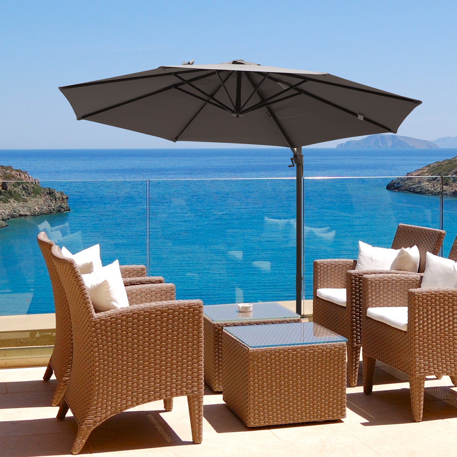 Ensure you keep yourself protected enjoying the sun with this large paraso from Outsunny. Made from powder-coated aluminium, the strong and durable central pole is resistant to rusting, peeling and corrosion to provide you years of use outdoors. Connected to the frame via eight steel ribs for extra strength, the polyester canopy is easy to clean and will not fade, as well as protecting you from harmful UV rays. Using a crank mechanism for easy opening and closing, the canopy is able to rotate a full 360 degrees via the foot pedal to suit your shade needs. A piece which every garden needs.