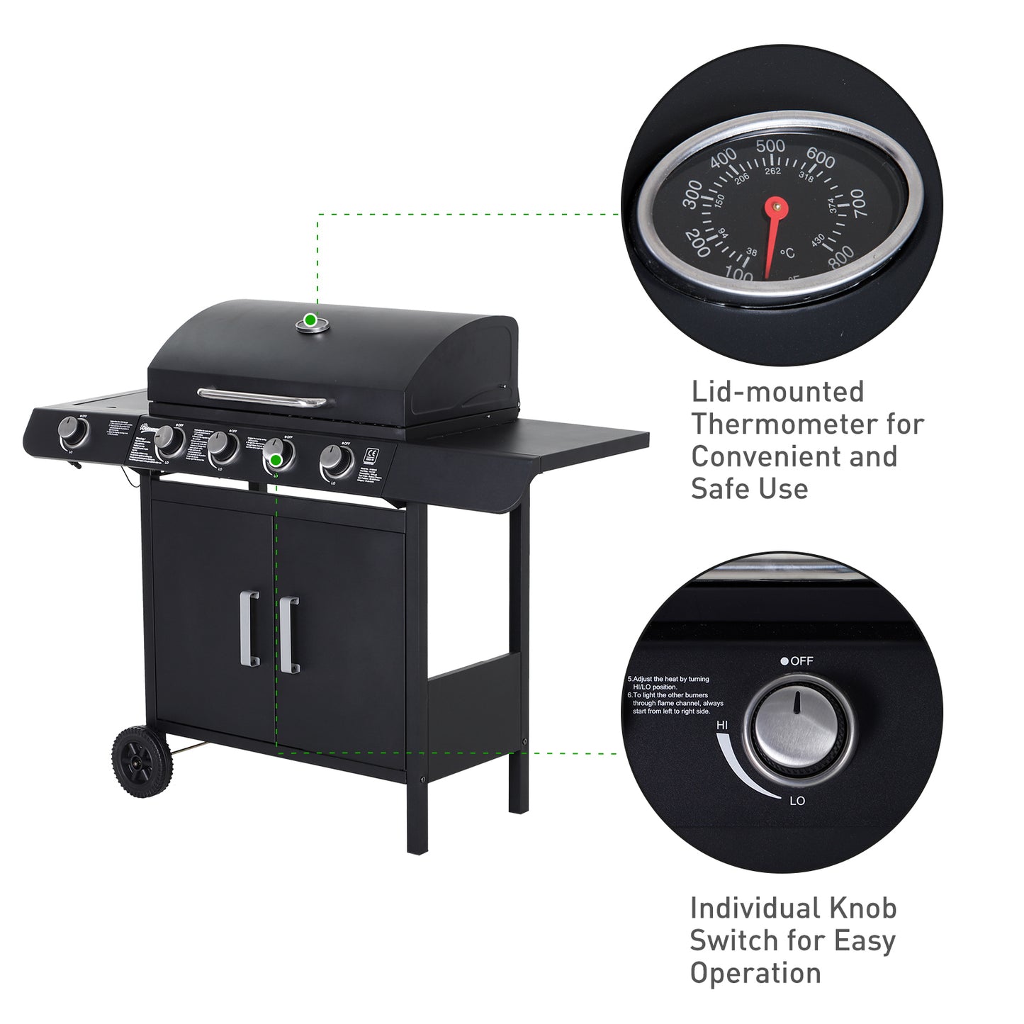 • 4 + 1 gas BBQ: The large size gas BBQ grill with 4 stainless steel burners and an aluminium side burner, great for outdoor barbecue parties. High temperature spray powder also ensures your safe use.