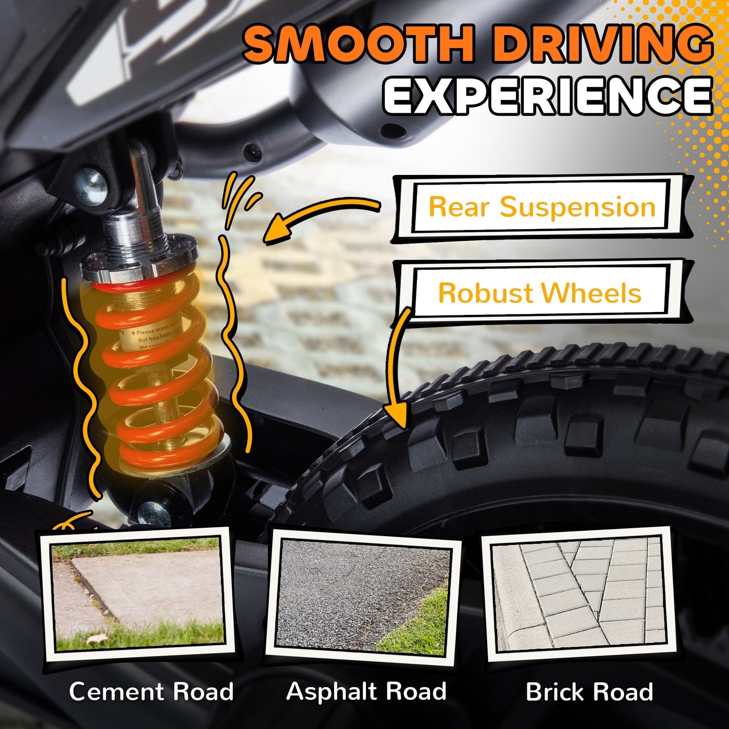 - Robust material: Designed with large Ø33.5cm PP wheels and a rear wheel shock absorber, this electric motorcycle is suitable for smooth surfaces. Made from plastic and metal and qualified by EN71-1-2-3, EN62115, it ensures a stable ride for kids.