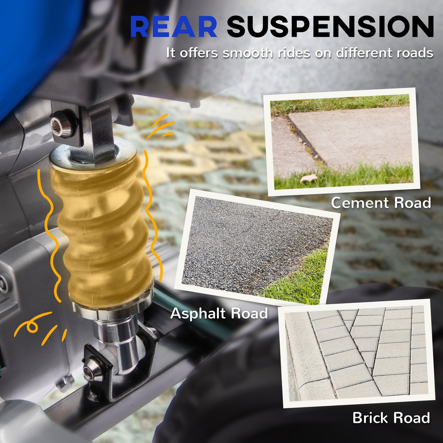 - Shock-absorbing wheels: The rear wheels of this kids motorbike come with shock absorption, ensuring a smooth ride on various surfaces like cement and brick roads.