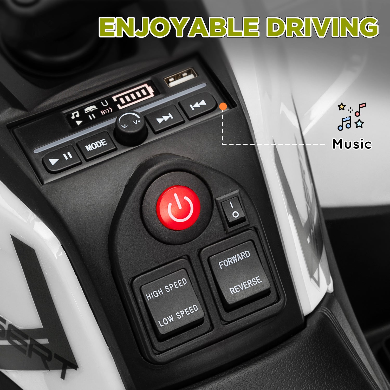 - Equipped with four headlights, music and USB for entertainment
