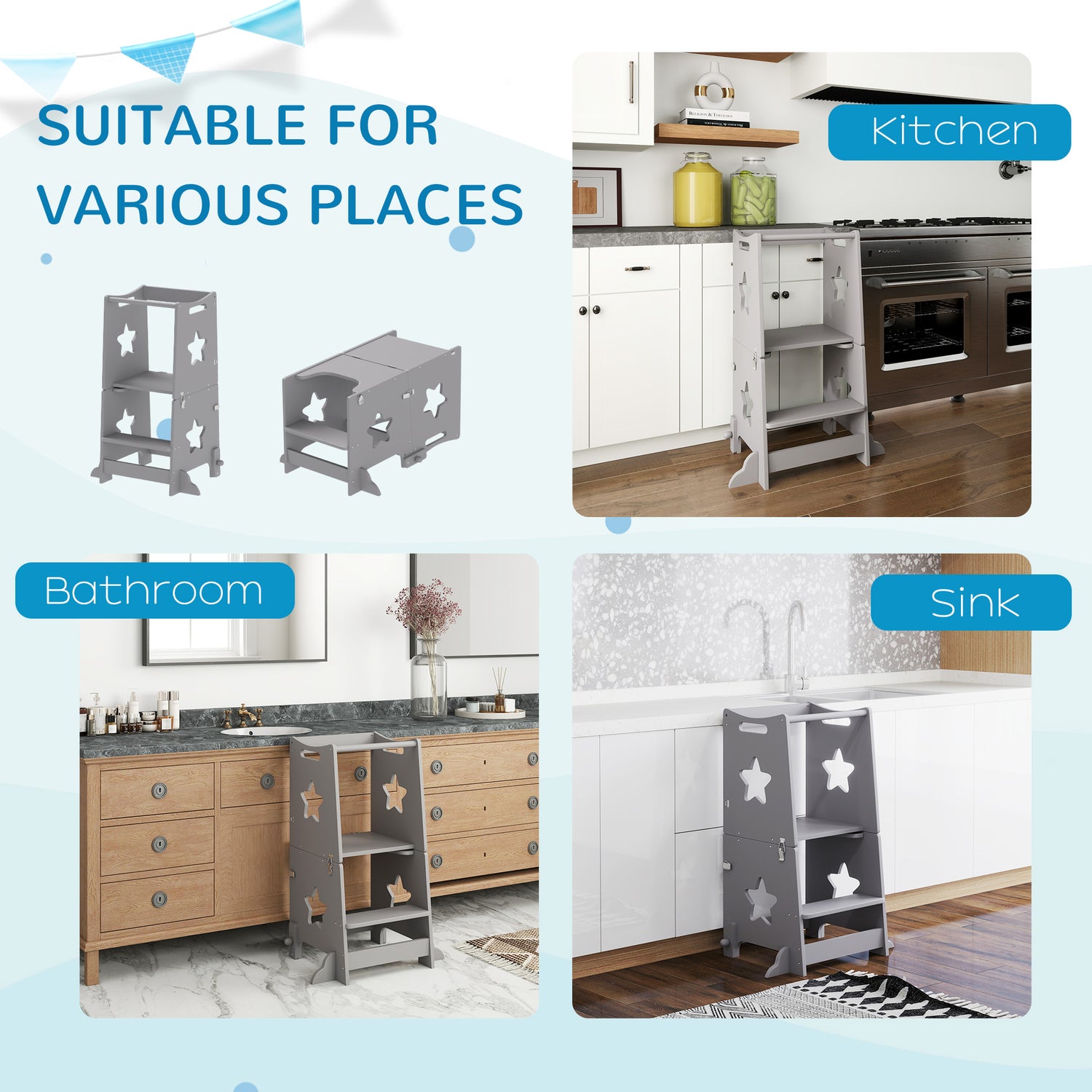 - Versatile: The toddler step is great for the kitchen, bathroom sinks or as an extra step near beds or tables.