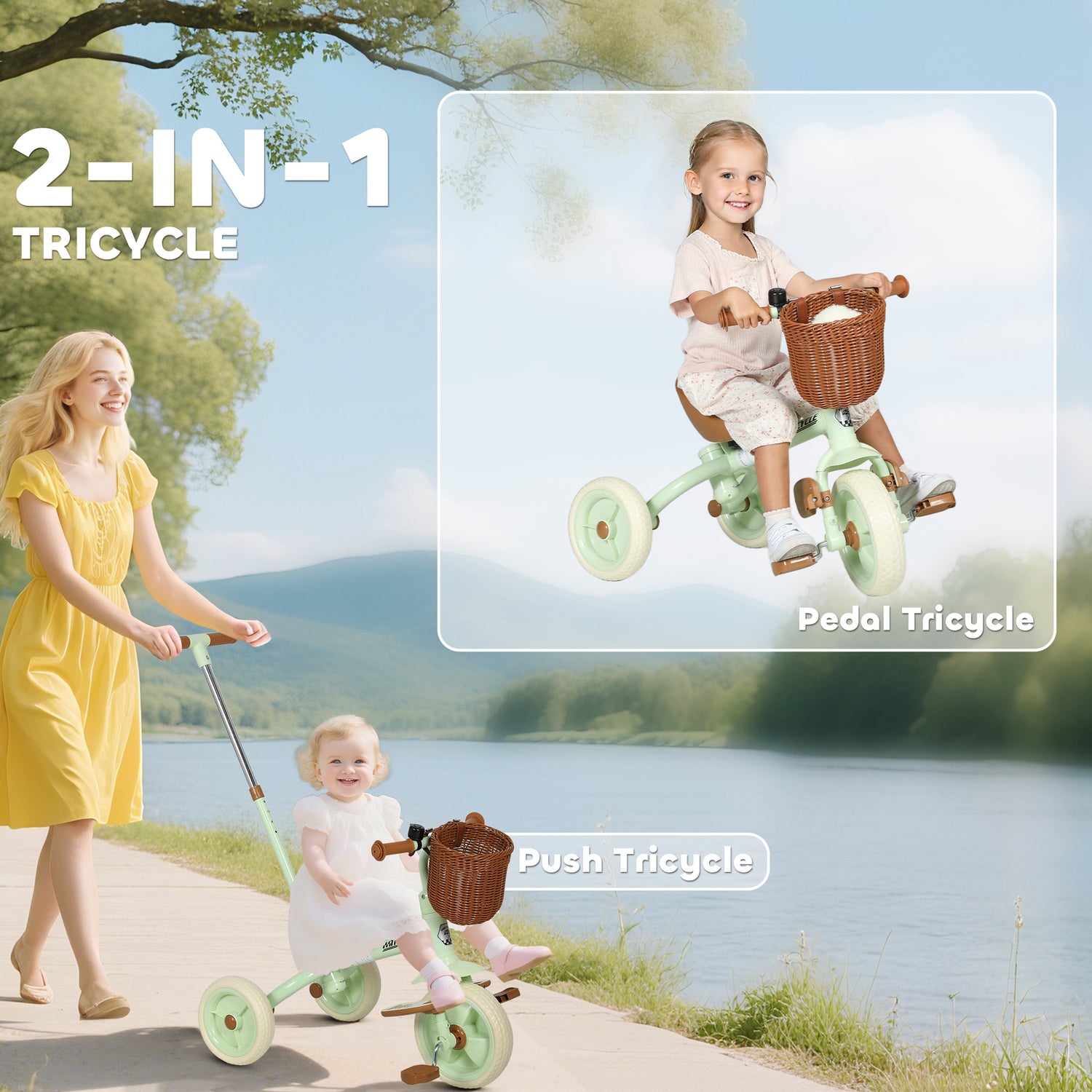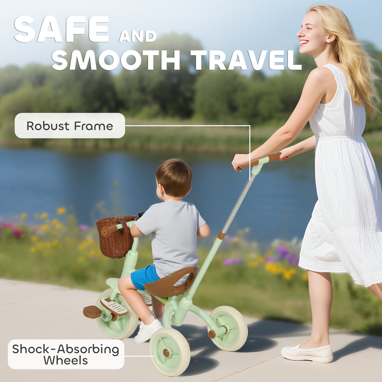 AIYAPLAY 2-In-1 Toddler Trike for 2-5 Years Old, 3 Wheel Bike with Adjustable Parent Handle, Basket for Boys and Girls, Green