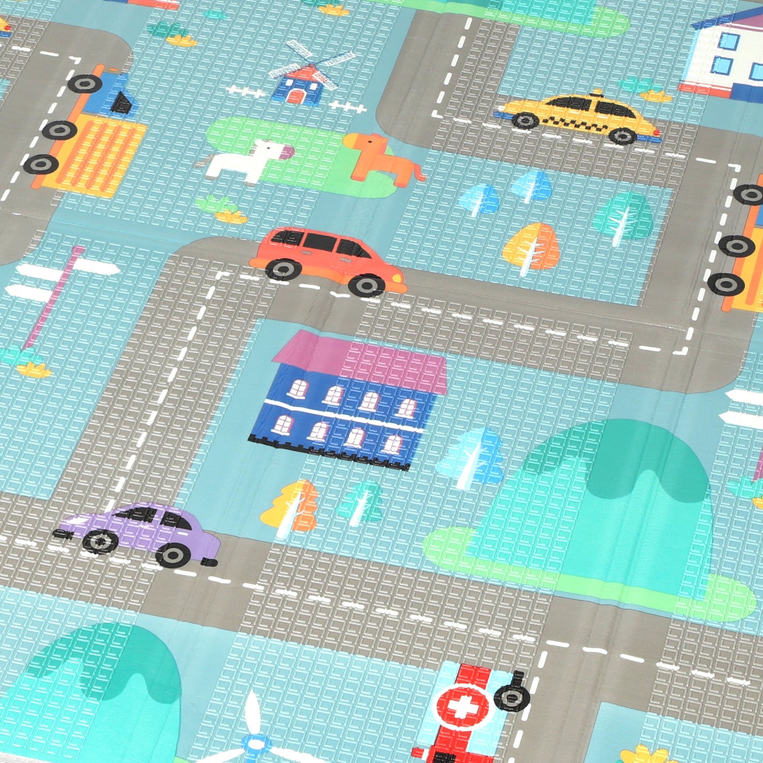 - Reversible kids playmat: Featuring roads on one side and rocking horses on the other, this baby playmat comes with two fun themes to captivate little imaginations.