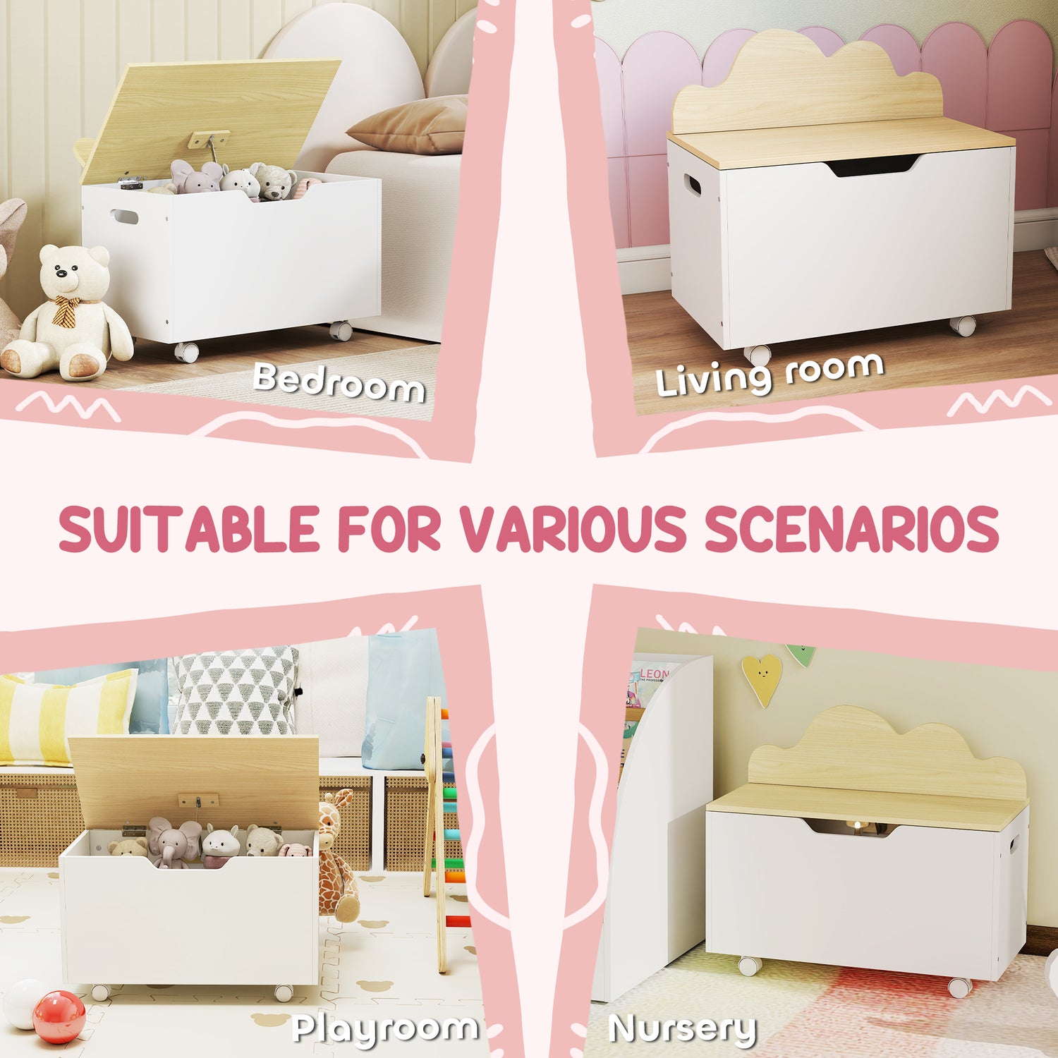 AIYAPLAY Toy Box with Lid, Toy Chest with Wheels and Safety Hinges, Toddler Storage Organiser for Playroom, Bedroom, White