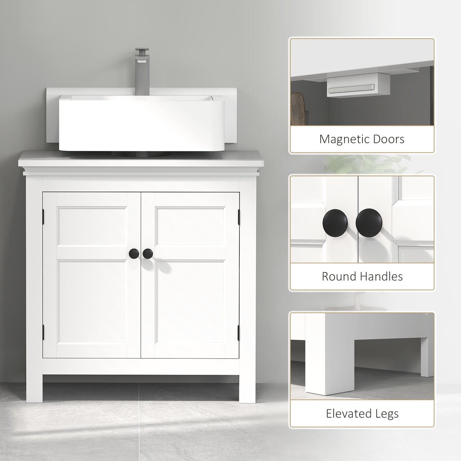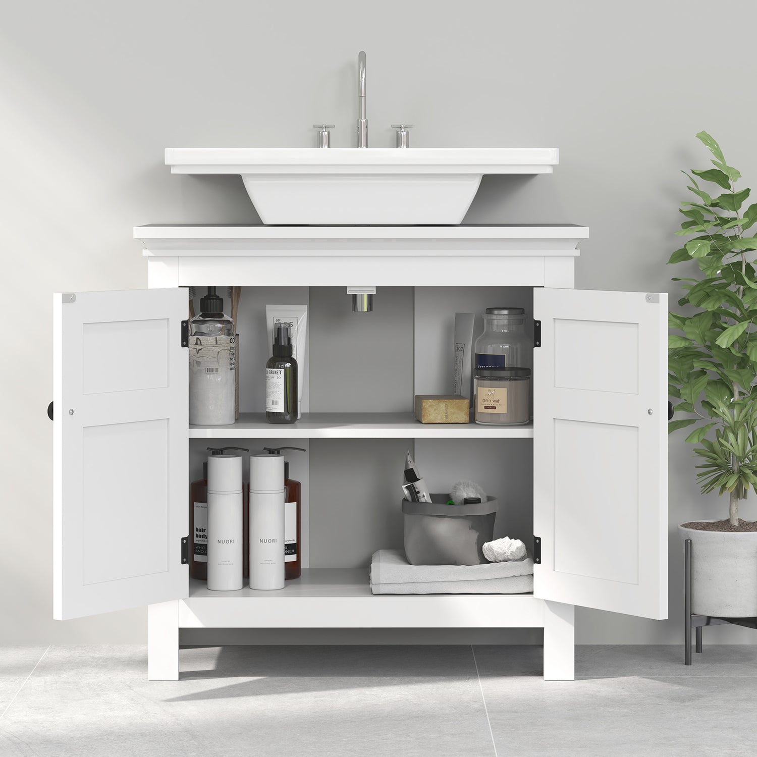 Extra space in the bathroom, easily with this HOMCOM under sink storage cabinet. Thanks to the 'U' slot, this bathroom storage cabinet snugly fits around wall-mounted sinks. Features two shelves, with three-level adjustable shelf for flexible storage. Our under sink unit completes with handy magnetic doors for easy access.