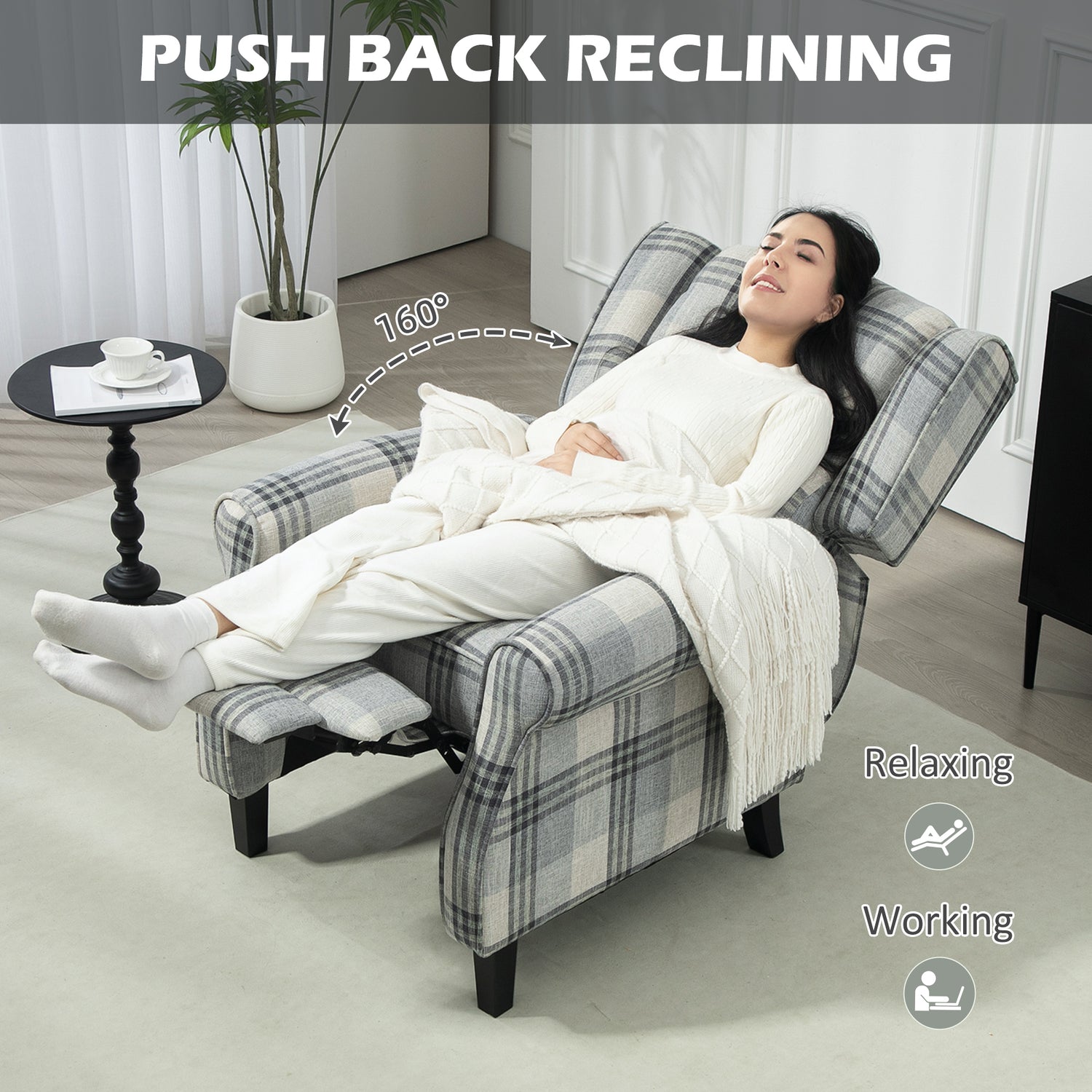 Smart, stylish and oh so comfortable – invite this HOMCOM recliner chair into your home and it will soon become a sure-fire winner everyone will be fighting to sit on. It's wrapped checked linen-feel upholstery: it's smooth and eye catching - a super combination. Set the back at any angle up to 160°: lie back to a position of your choice. Filled with sponge, the comfy chair for living room is very comfortable, with the thick padded back offering support.