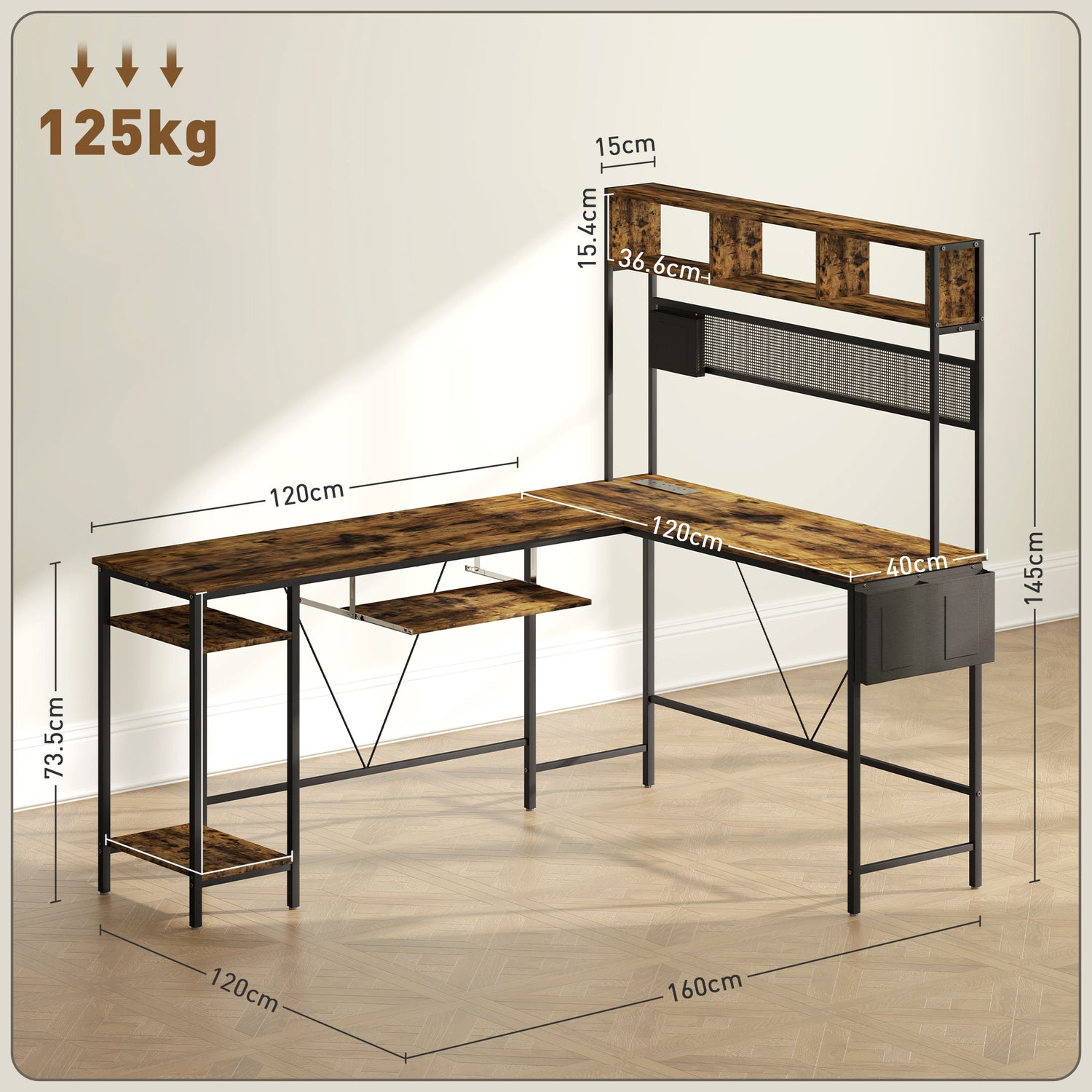 HOMCOM 160cm Reversible L Shaped Desk with Outlet, Corner Desk w/ Storage & Tray, 240cm, Rustic Brown