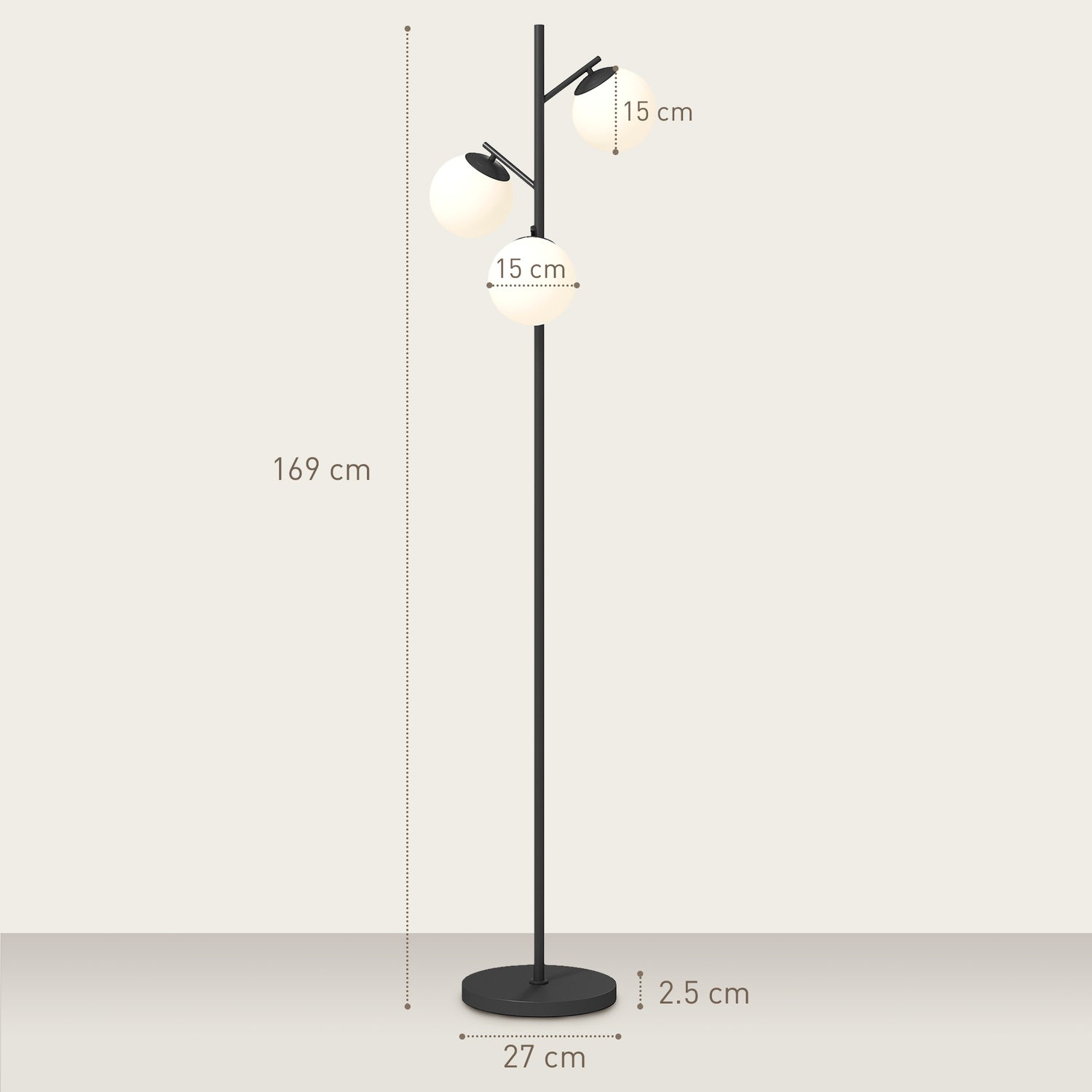 HOMCOM 3-Light Tree Floor Lamps for Living Room, Modern Standing Lamp for Bedroom with Globe Lampshade, Steel Base, Bulb not Included, Black