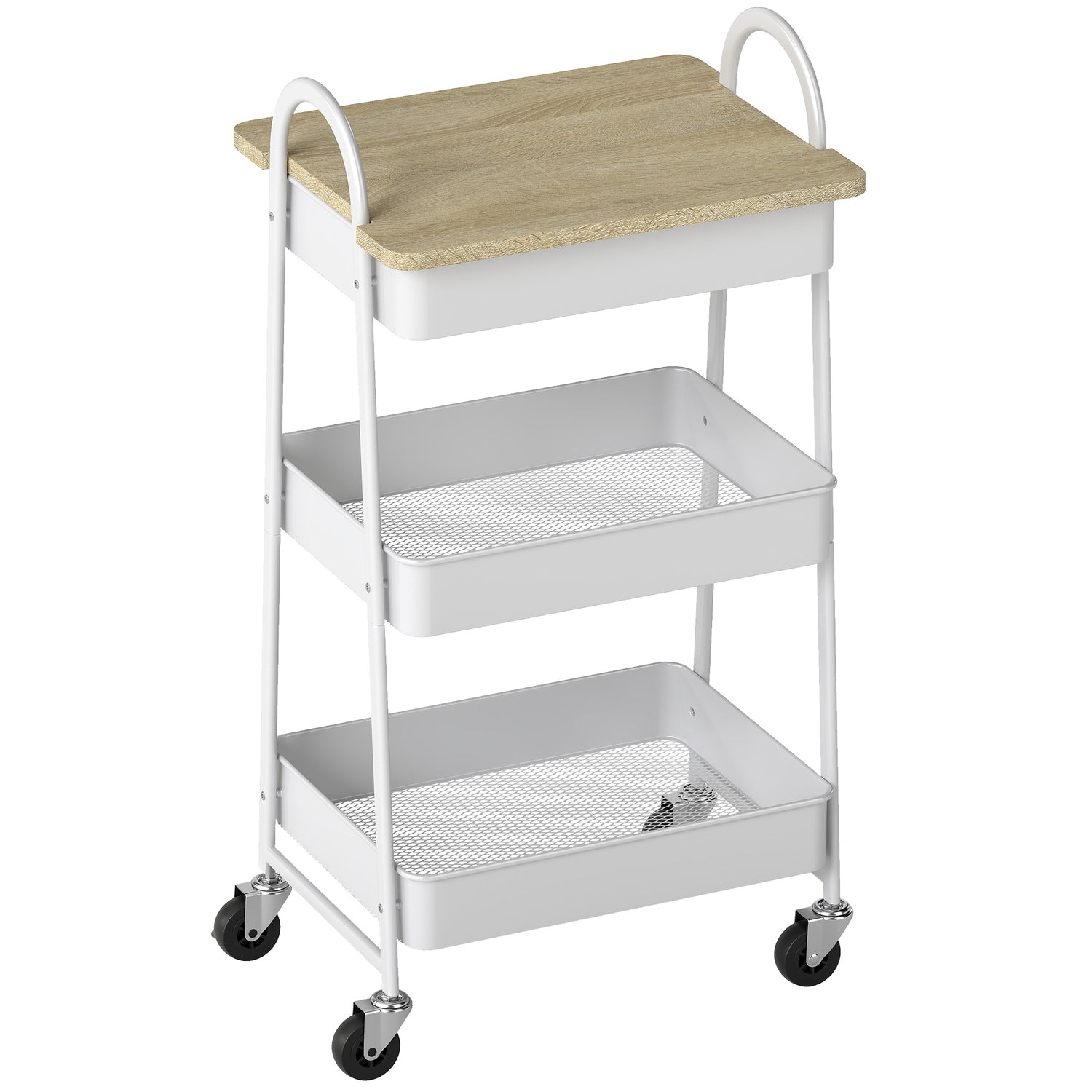 HOMCOM 3-Tier Kitchen Storage Trolley with on Wheels Cover Top Board - White and Oak