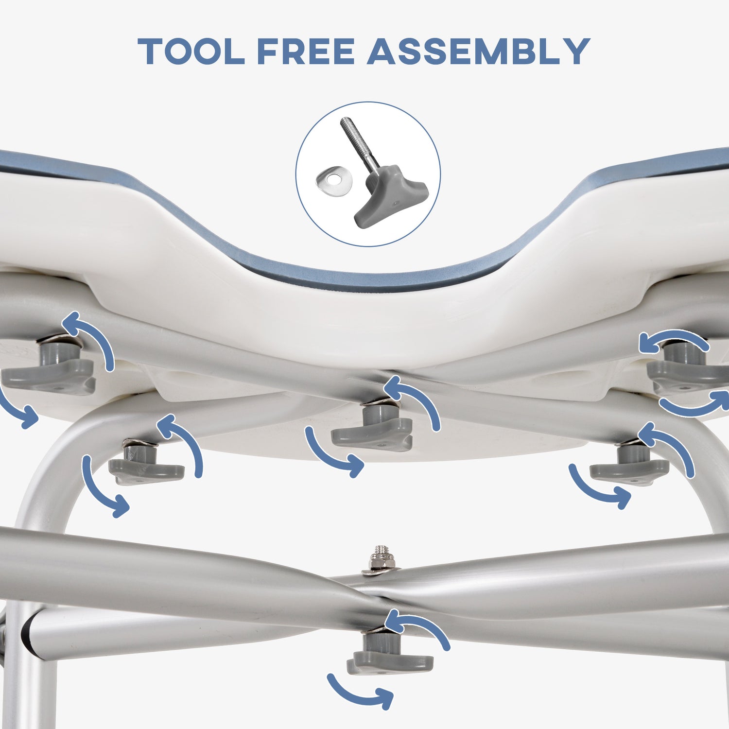 - Aluminium frame: Shower stool has a strong and supportive core. Metal is naturally suitable for wet environments. Under seat cross base for extra support when you sit
