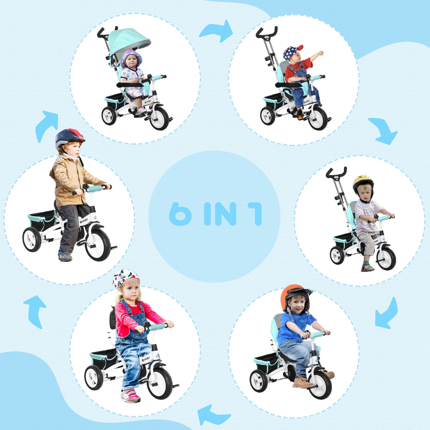 - 6-in-1 Use: This bike stroller is versatile, serving as a baby stroller, push trike, training bike, independent bike(with cushion), independent bike(without cushion), independent trike (without back). Ensures a comfortable and safe ride for your child as they grow.