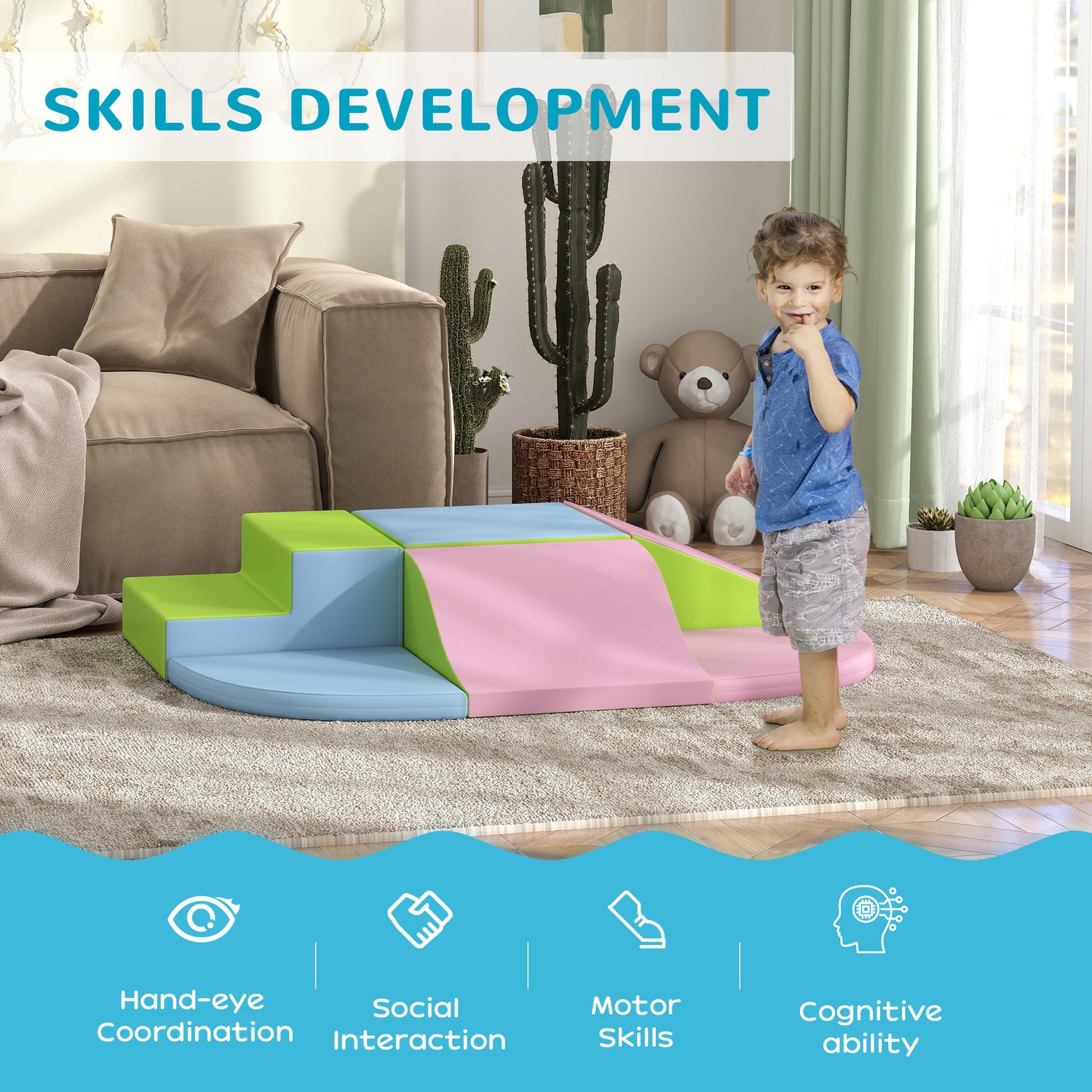 - Easy cleanup: The soft blocks' covers are wipeable for easy cleaning. For durability, it is advised that children take off their shoes before playing.