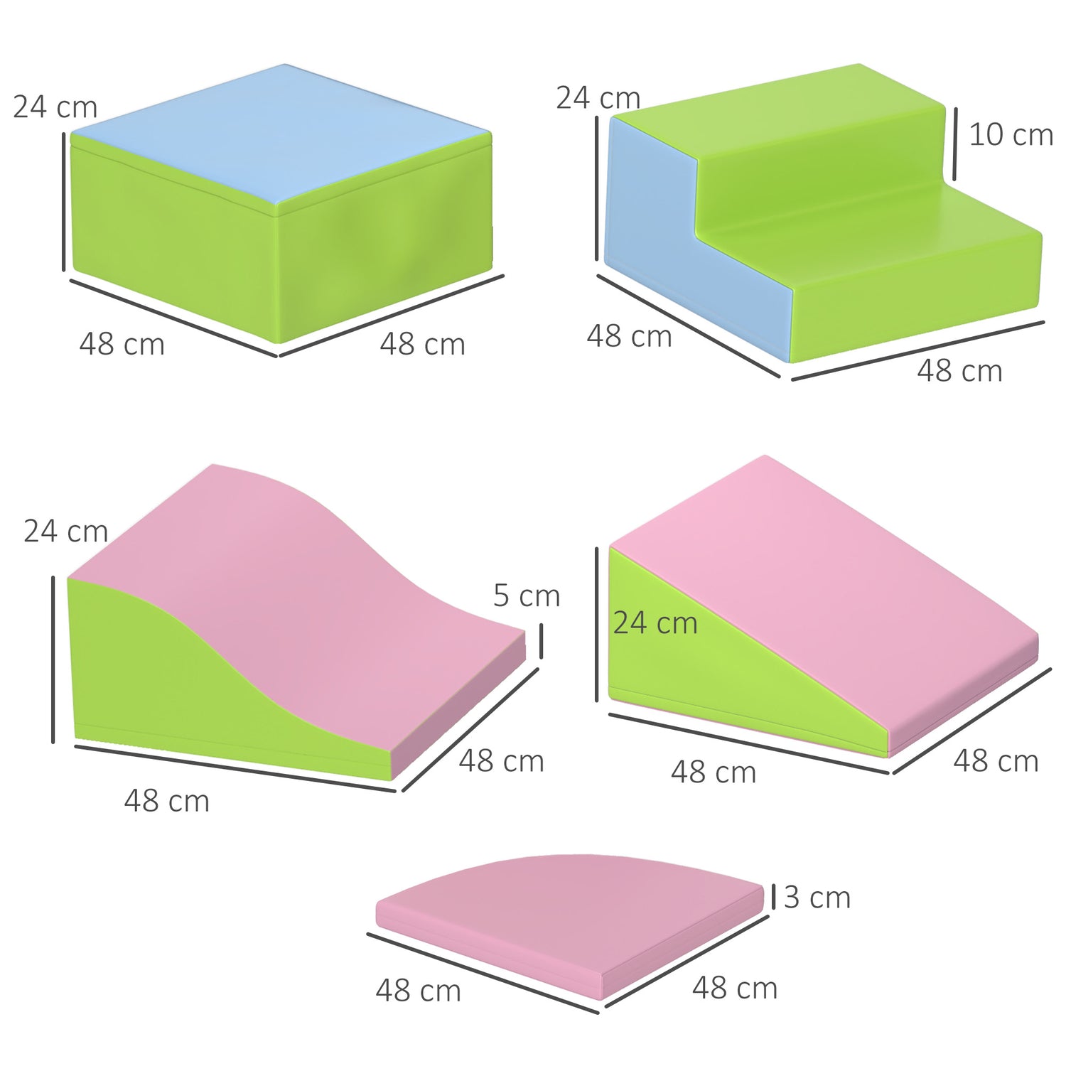 - Dimensions: Square: 48L x 48W x 24H cm. Stair: 48L x 48W x 24H cm. Ramp: 48L x 48W x (5+24)H cm. Sector: 48L x 48W x 3H cm. Slope: 48L x 48W x 24H cm. Suitable for ages 1-3 years old, supports up to 60kg. Standard: EN71-1-2-3. No assembly needed.