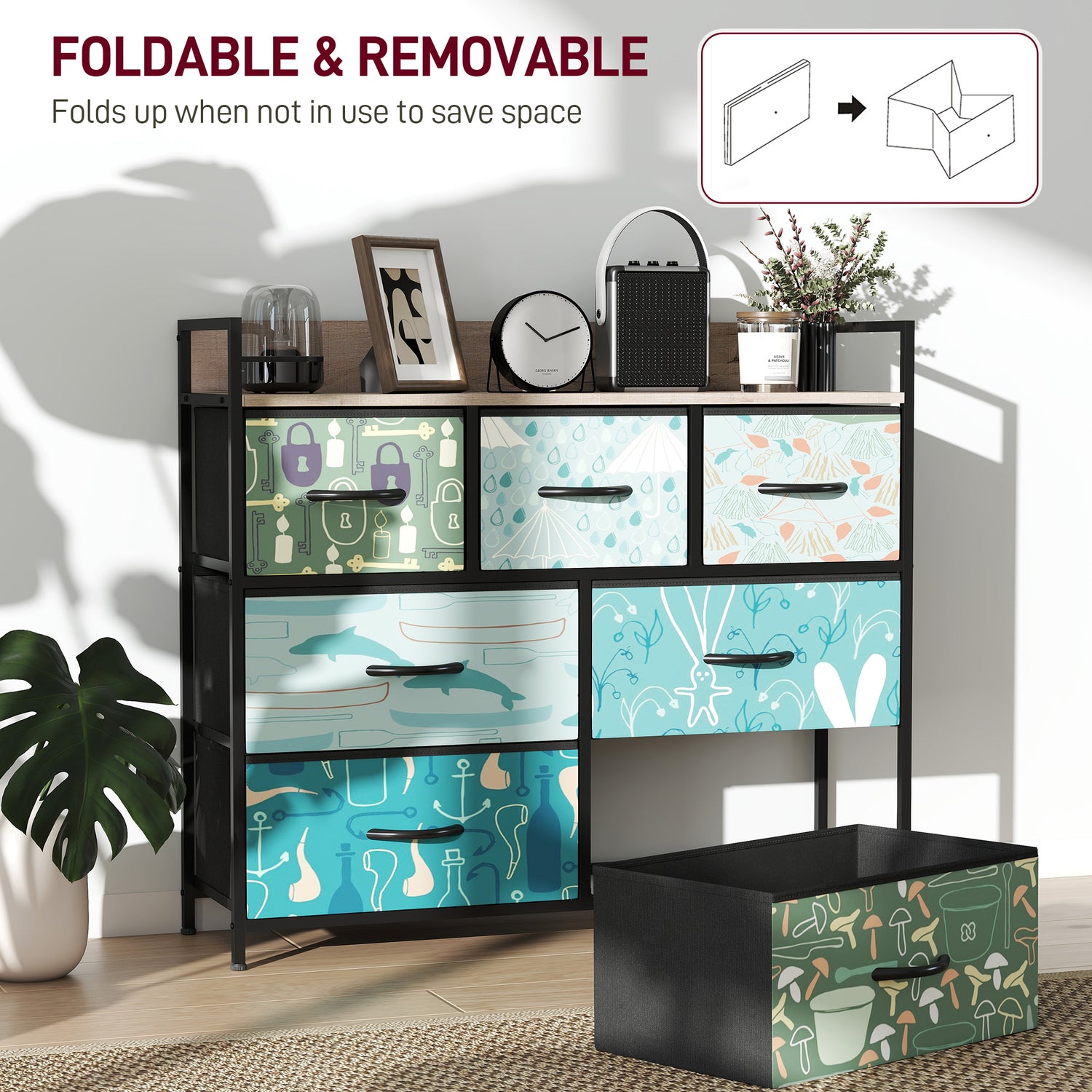 - Seven drawers: Fabric chest of drawers offers plenty of storage for various items. Drawers can be removed and folded