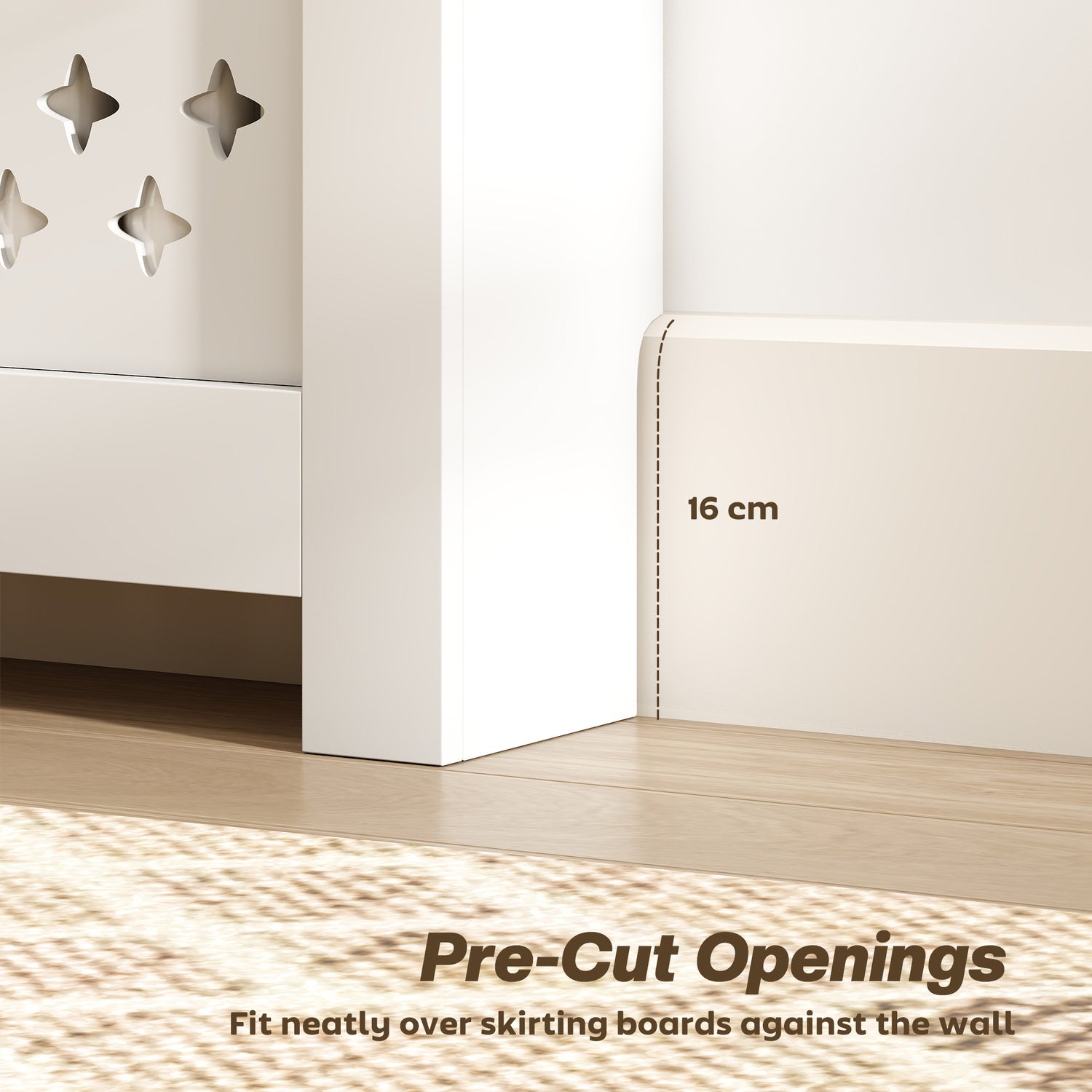 Safety ensured around radiators with this HOMCOM protective cover. Made from a particle board and MDF blend, this is a reliable piece made for everyday use; it comes in a white body with a wood-effect for a simple design which looks great in plenty of different interior styles. The front cross cut-outs ensure heat can escape from the cover - so you can actually feel your radiator and keep warm as normal. It's complete with a top drawer for discreet storage.