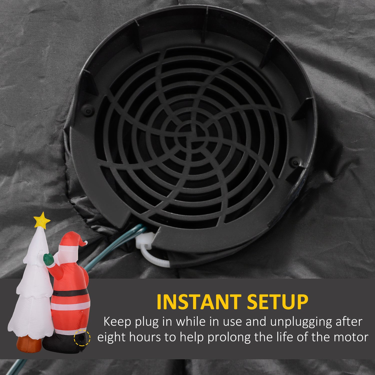 - No-hassle set up: To inflate: Step 1 - Plug it in and turn the power on. Step 2 - Done. For real, it's that easy. Unplug it, it deflates. (It seriously takes you longer to put together your plate of milk and cookies.) When you're ready to deflate, this storage bag will allow you to put the inflatable safely away for next year.