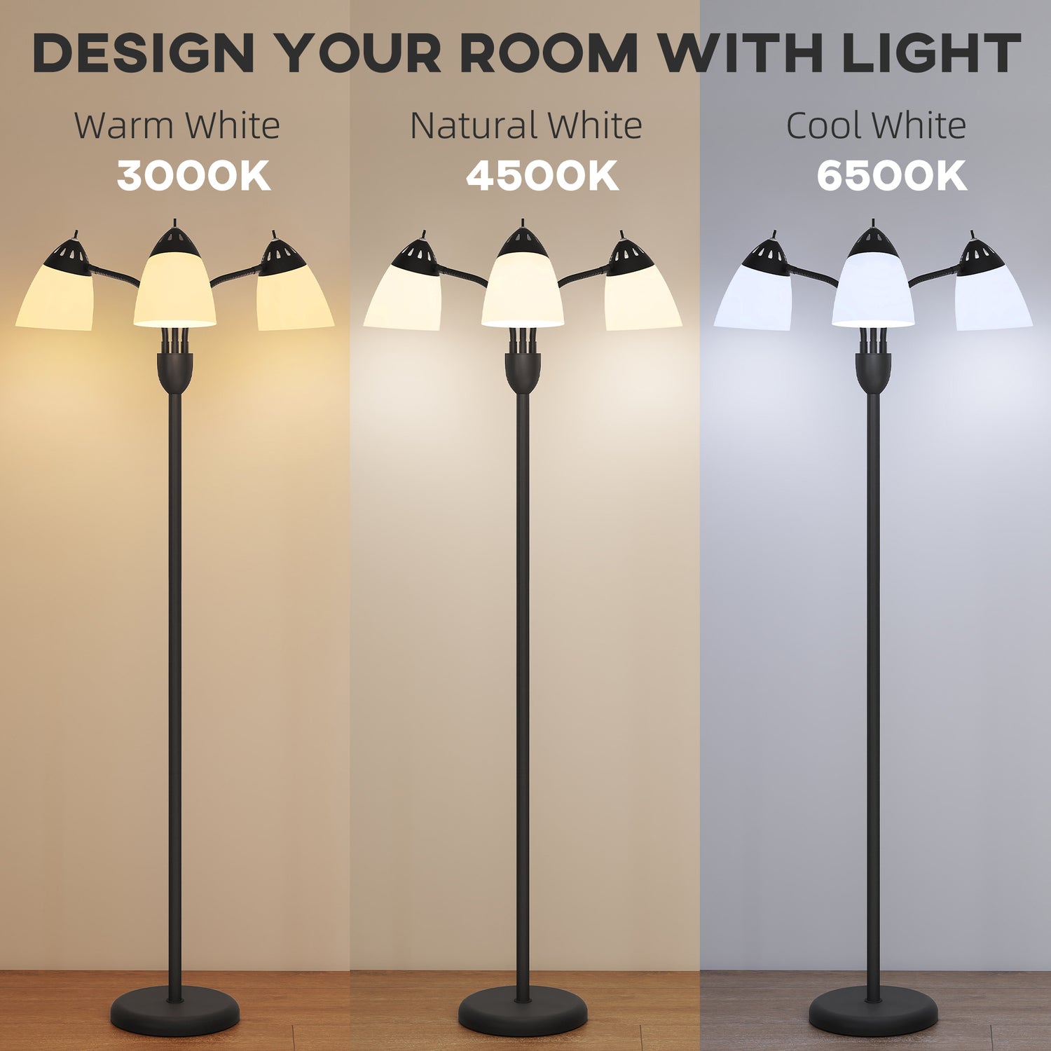 - Three-light lamp: This living room lamp features three E27 sockets with included A60 bulbs. Switch between 3000K, 4500K and 6500K colour temperatures. Each bulb delivers 750lm brightness with Ra>80, offering versatile and natural lighting for any space.
