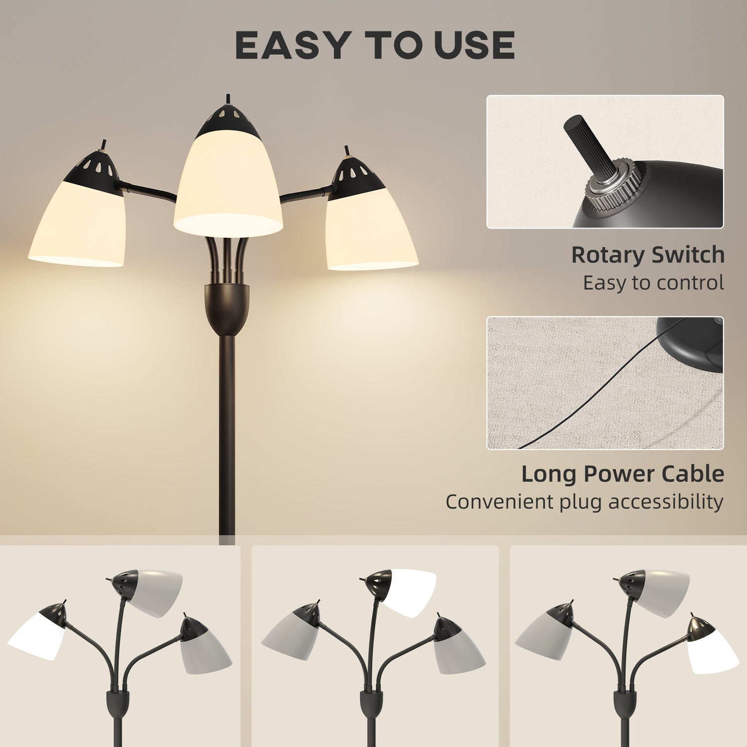 Create the atmosphere you want with this HOMCOM floor lamp for living room. The tall tree design comes with three opaque shades - the fully flexible 360° movement means you can direct the light in any position you desire. Each light can also be turned on and off individually, so you can have your space either bright or dim. Made from steel, the structure is strong, with the heavy round base meaning this home light stands tall and proud, all day and night long.
