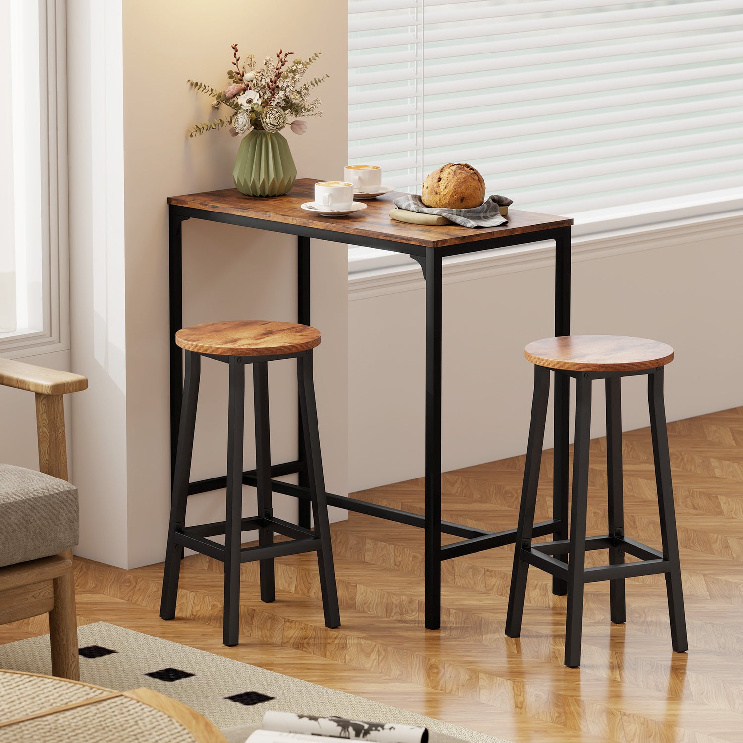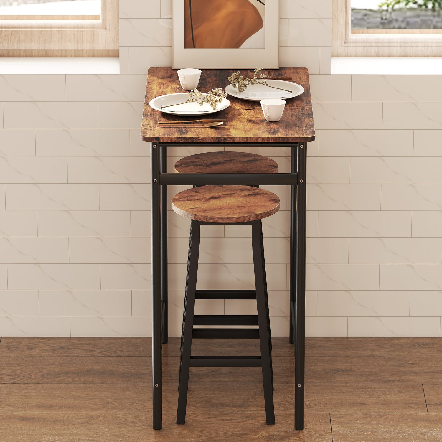 - Industrial style: Rustic brown panel brings a cosy, homey touch, while sleek black frame adds a hint of industrial charm. Retro chic bar stools make every kitchen moment feel special-from casual breakfasts to evening chats