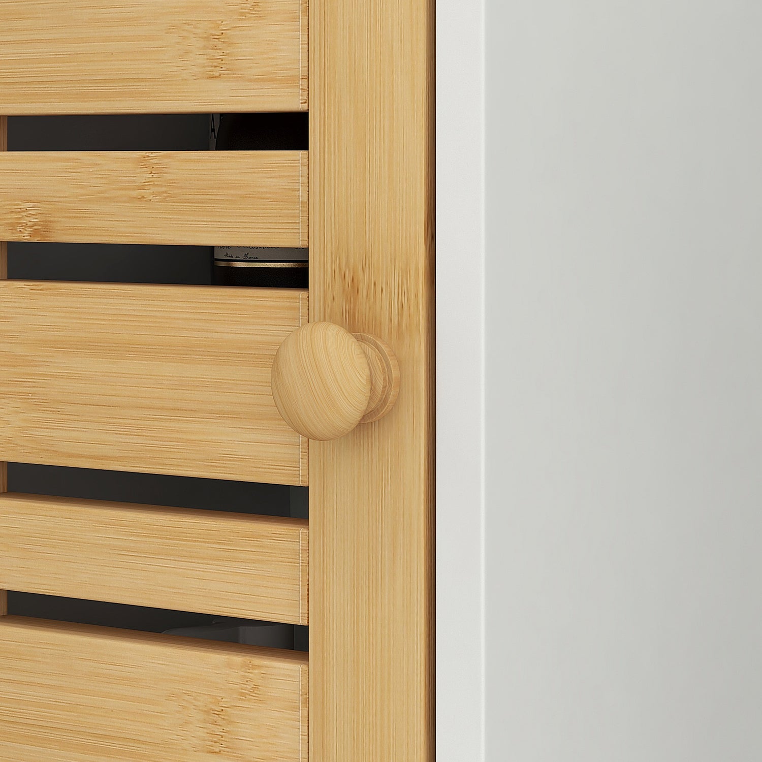 - Sleek and functional: Boasting a tall and slim design, this bathroom storage cabinet is crafted from a painted MDF frame, blending elegance with functionality. Bamboo slat door of the cabinet facilitates air circulation.