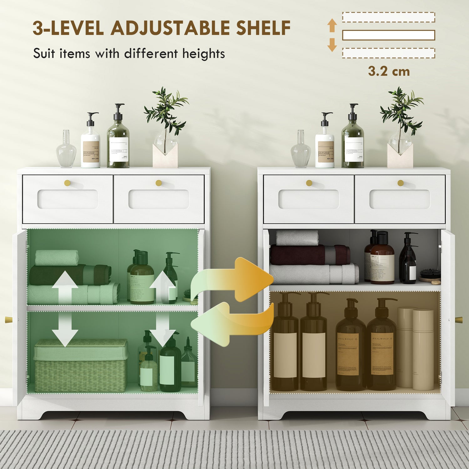 Bring calm and order to your bathroom with this stylish floor cabinet from HOMCOM. Whether it's storing spare towels, skincare, or cleaning essentials, the mix of drawers and a roomy cupboard keeps everything tucked neatly away. The adjustable shelf makes it easy to fit taller bottles, while the strong build supports up to 55 kg—great for daily family use. Finished in soft white with arched doors and gold-tone touches, the bathroom storage unit adds a gentle, classic charm to your space.