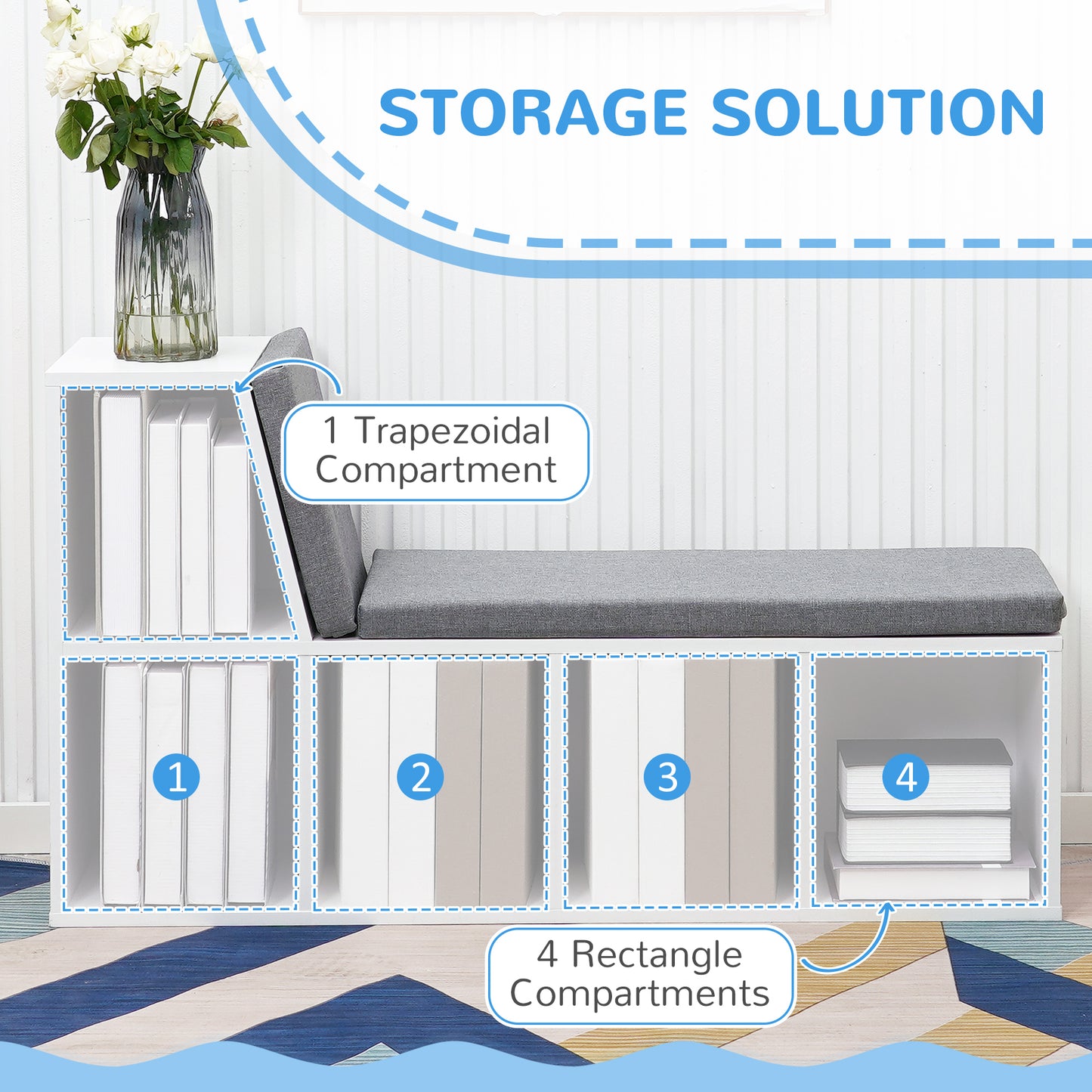 Functional and modern, this small bookshelf from HOMCOM is the perfect piece for most spaces and styles. Its large storage design gives convenient and independent spaces for different items, keeping your room neat and clean. With the special design, you can sit down and lean there to reading with comfortable cushions. In addition, the white bookshelf is ideal for the living room, bedroom, study room, and office. Don't hesitate to take this contemporary bookshelf home!