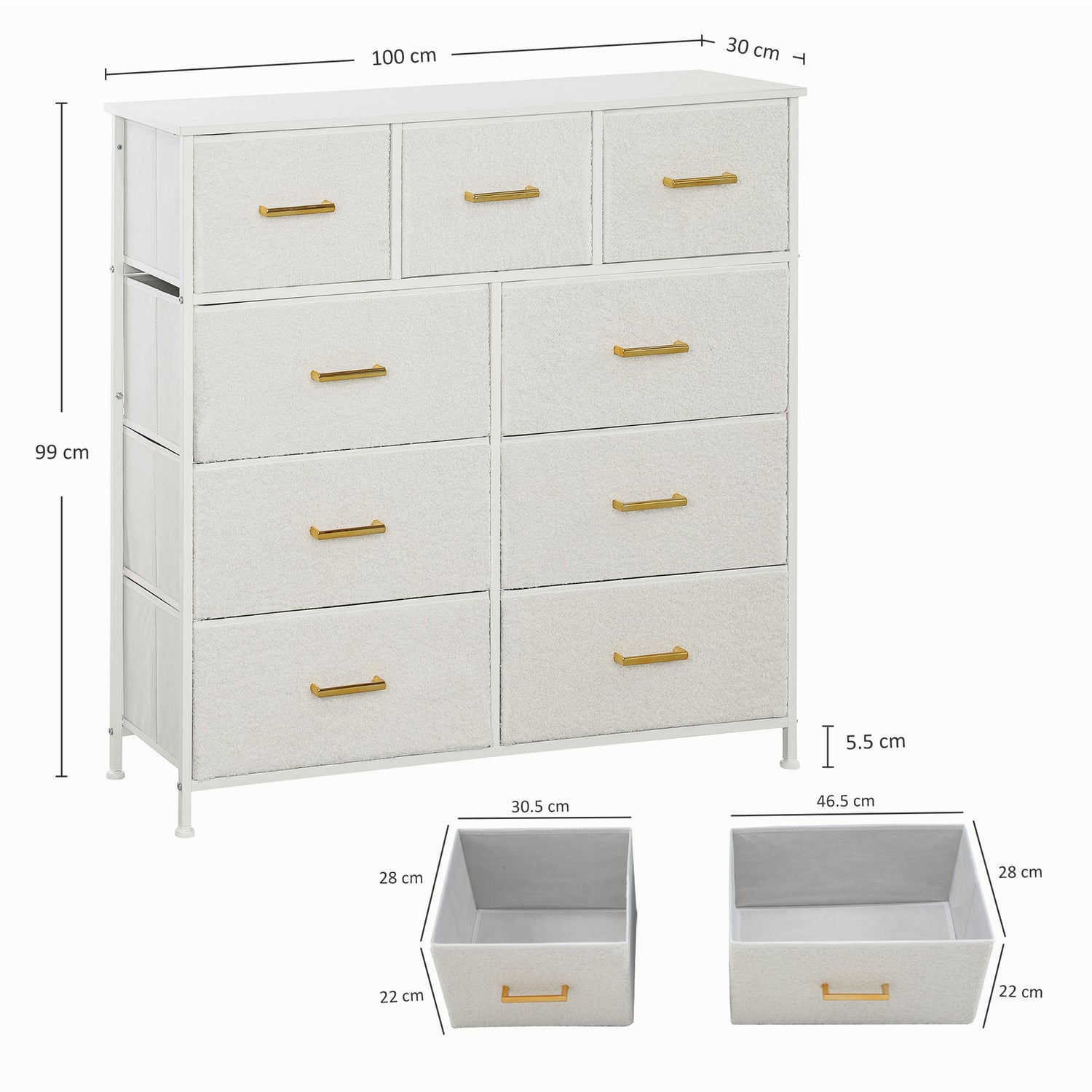 HOMCOM Chest of Drawers with 9 Fabric Drawers, Boucle Storage Organizer, Steel Frame, Fabric Dresser for Bedroom, Cream White