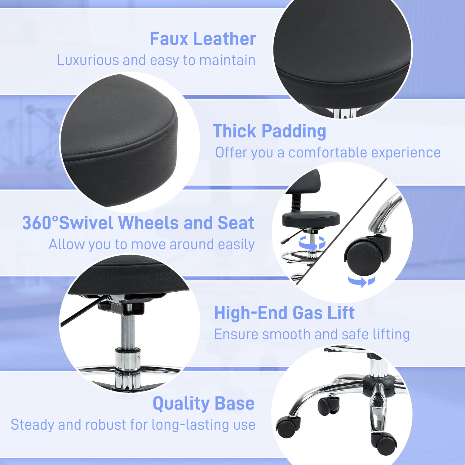 - Luxurious design: Upholstered in elegant waterproof faux leather, this beauty stool combines a chic, modern look with easy maintenance. The medium-density foam adds extra comfort, making it great for long, relaxing sessions