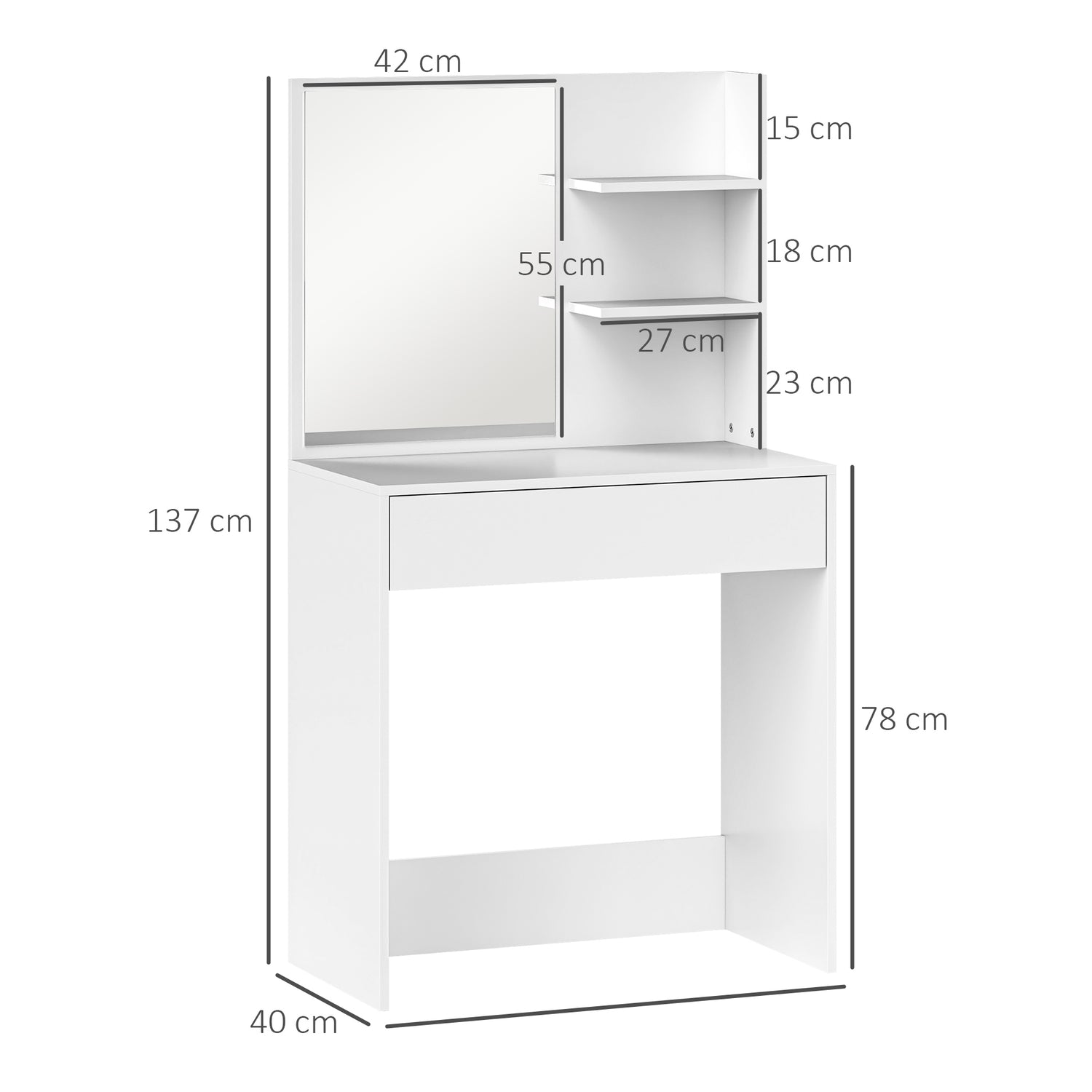 Keep your jewelry and makeup neatly arranged with this sleek HOMCOM vanity desk. Featuring a broad surface, vertical shelving and a large drawer, it's great for storing all your beauty essentials. The oversized mirror offers great visibility and its robust, anti-tip straps promise secure usage. Bring a dash of elegance to your bedroom with this chic vanity!