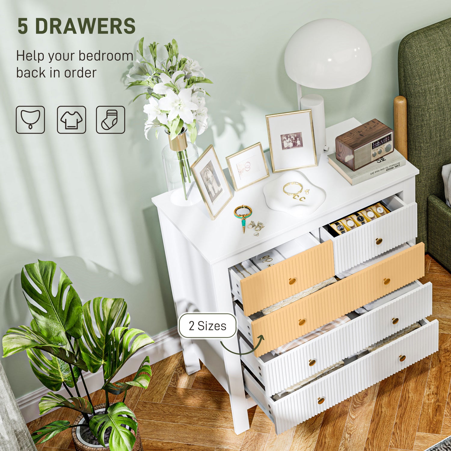 - Five-drawer dresser is spacious. Organises clothes efficiently
