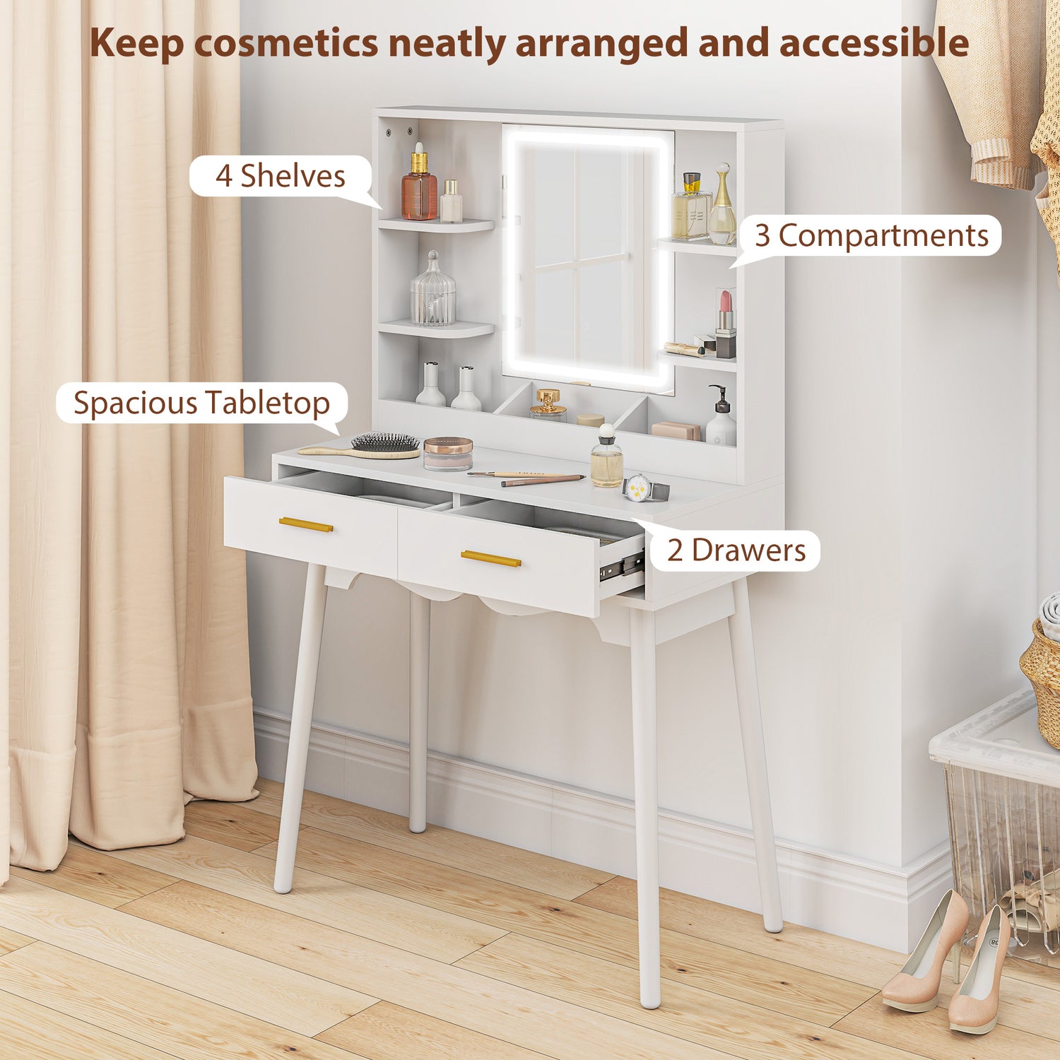 - Multi-storage: Vanity desk comes with two drawers, four shelves and three compartments - all the room for holding and organising your beauty essentials. Keeps them within close reach as you're getting ready