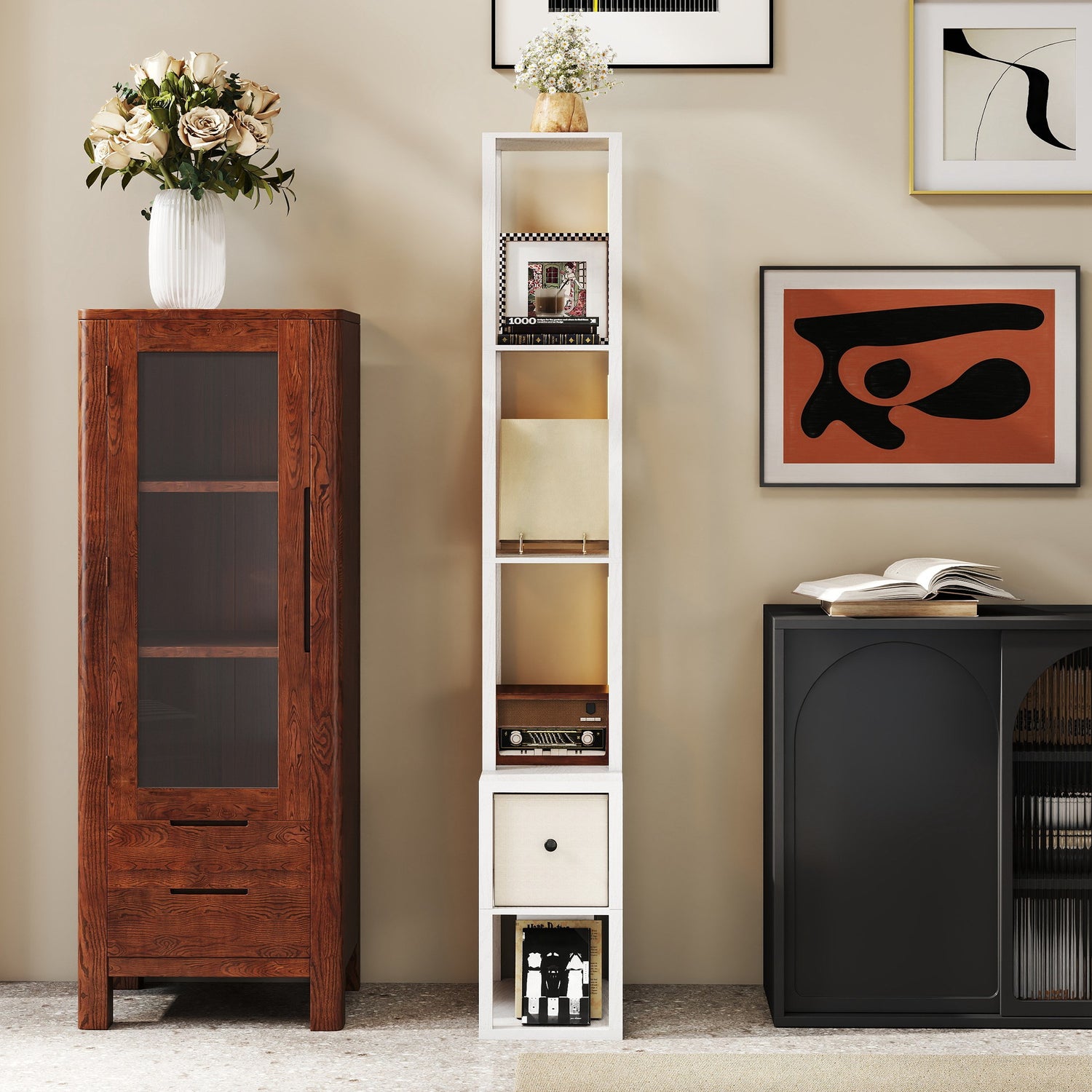 - 3-in-1 floor lamp integrates lighting, storage and display