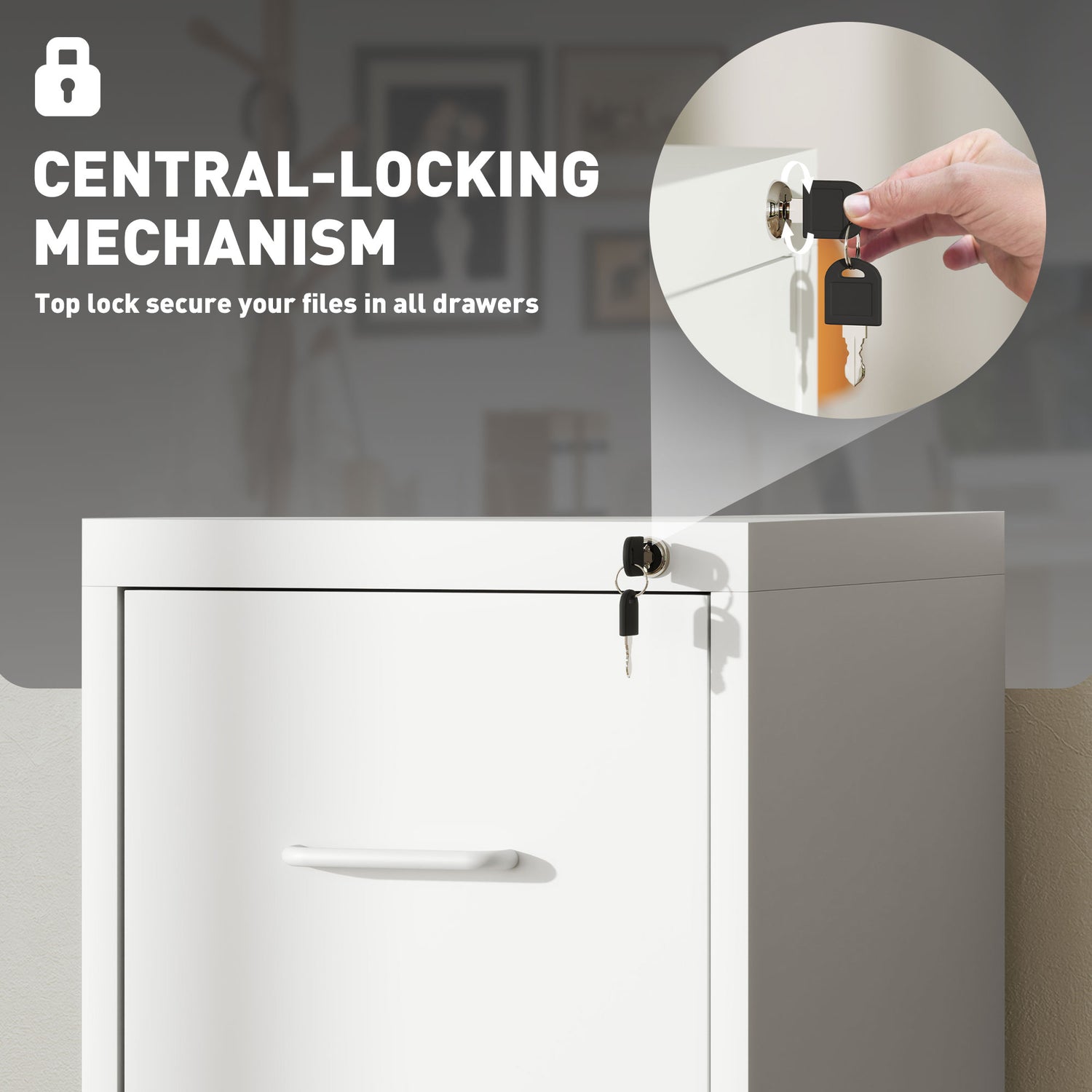 Keep your workspace tidy and organised with this HOMCOM filing cabinet. It features four drawers with adjustable bars for A4 and letter size files - plenty of room for keeping paperwork together. The top centre-locking system ensures locks all drawers simultaneously for security. Enjoy a clutter-free space with a modern touch.