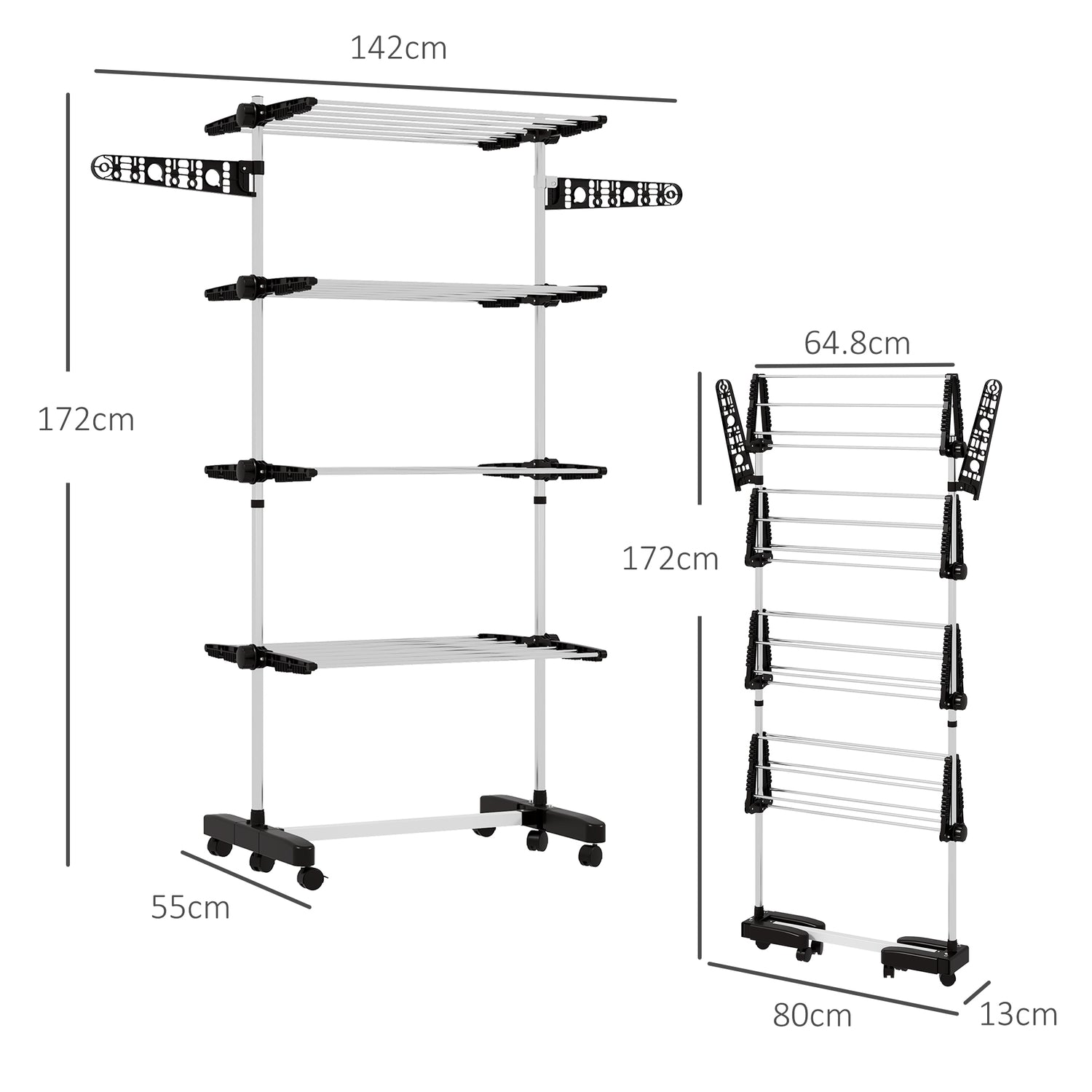 HOMCOM Four-Shelf Collapsing Clothes Horse, With Side Arms and Wheels - Black