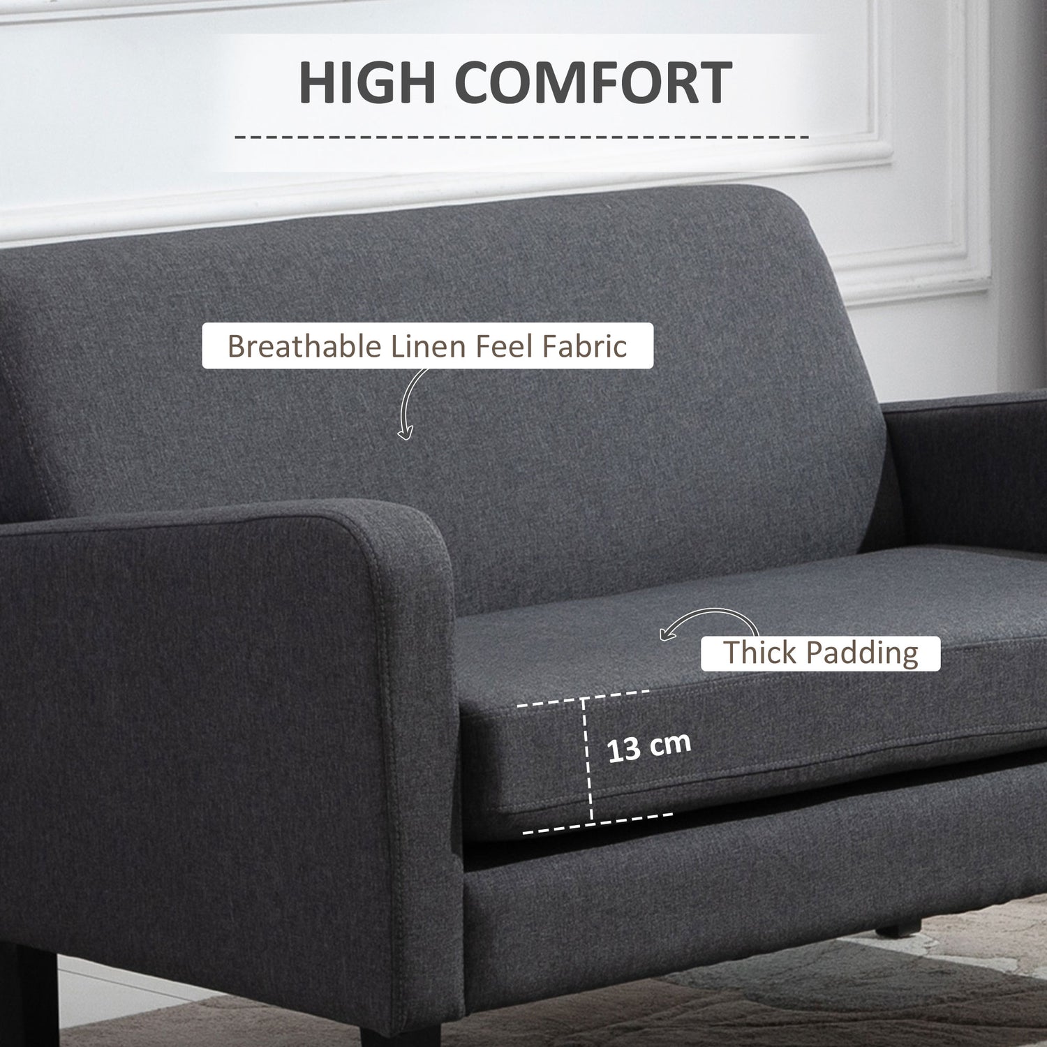 - Linen-look upholstery: Fabric on the two seater sofa is smooth and gentle on the skin. Dimensions: 74H x 122W x 72Dcm.