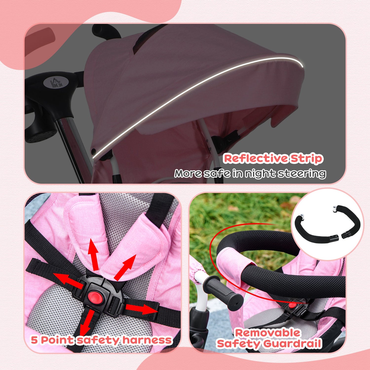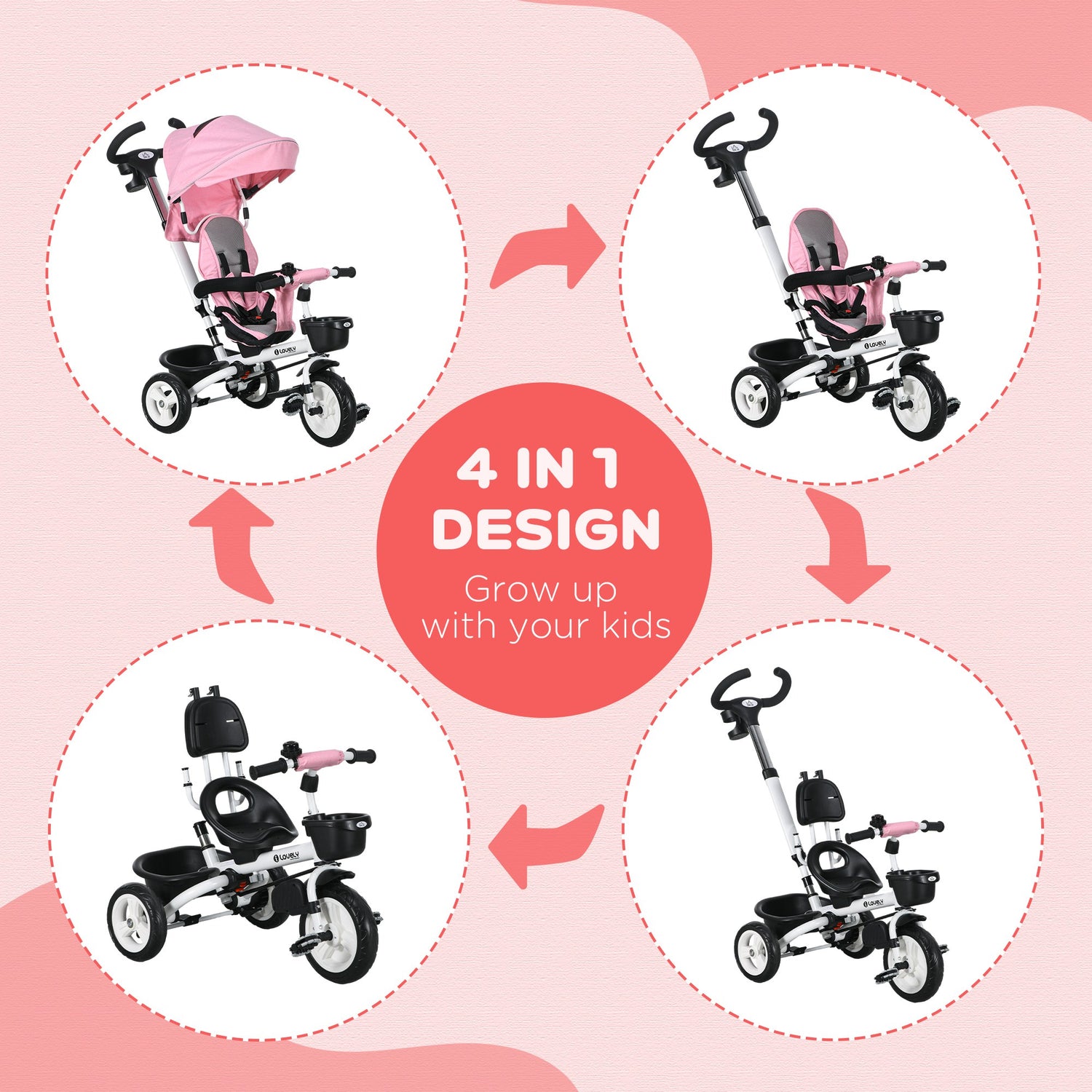 HOMCOM Metal Frame 4 in 1 Baby Push Tricycle with Parent Handle for 1-5 Years Old Pink