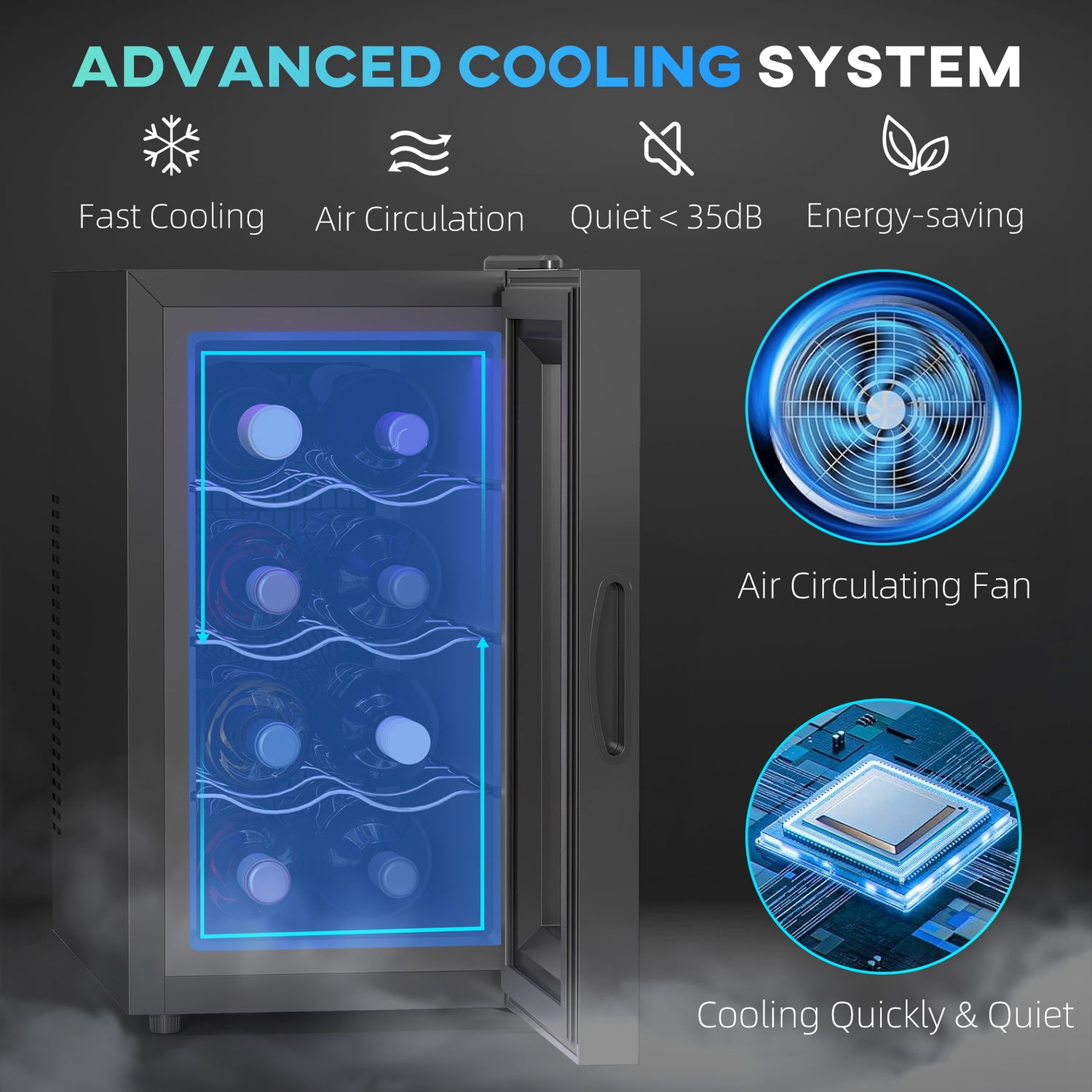 Chill your favourite wines to perfection with the HOMCOM Wine Fridge with glass door, featuring silent thermoelectric cooling and efficient class-E low-energy consumption. Perfectly sized for desktops or under counters, this drinks cooler fits seamlessly into any cosy nook. With three full-length chrome racks and adjustable settings, it's suitable for anything from champagne to beer, ensuring your drinks are always ready for the party.