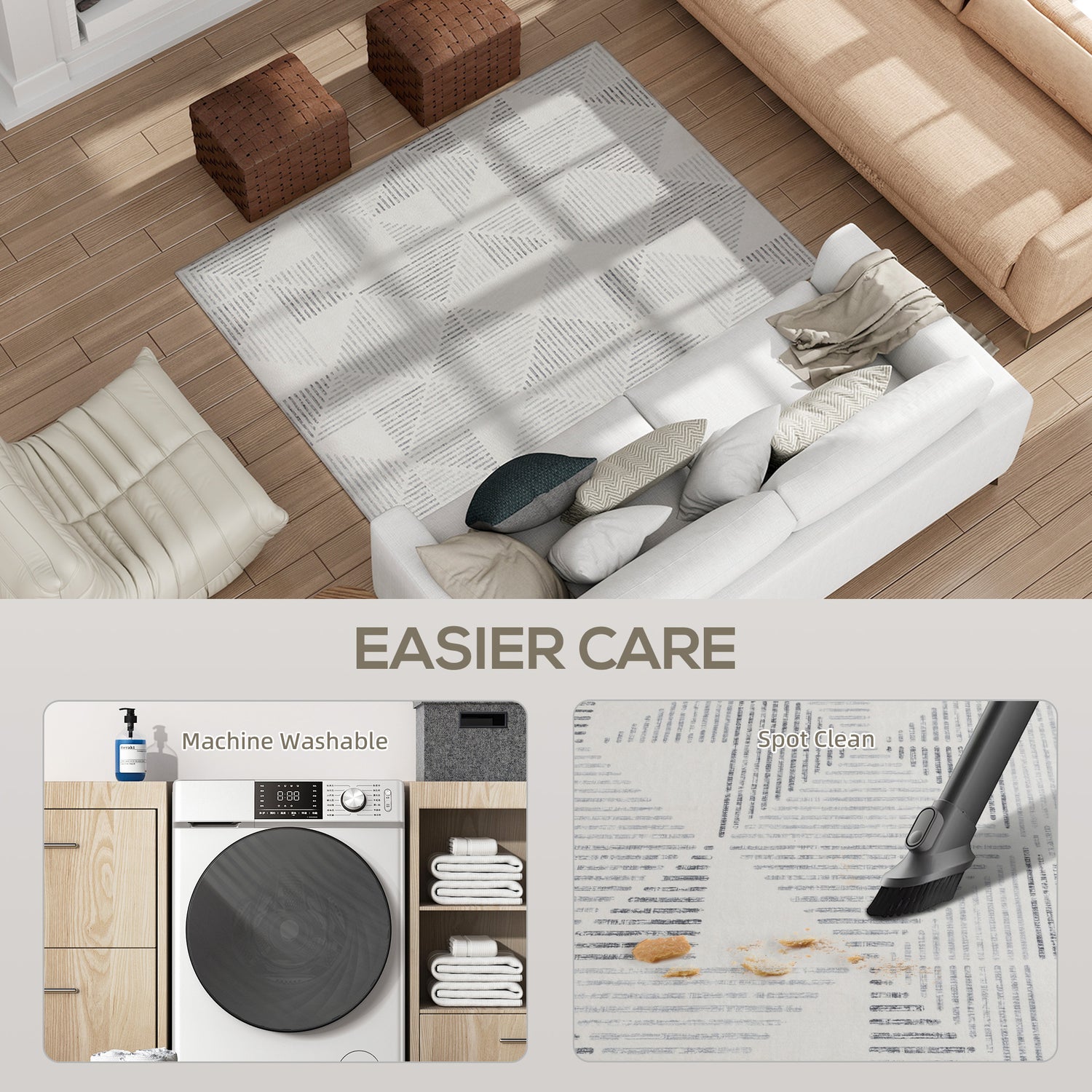 - Easy-care living: Machine washable or wipe clean with a damp cloth, keeping your living room rug fresh and making daily maintenance quick and stress-free