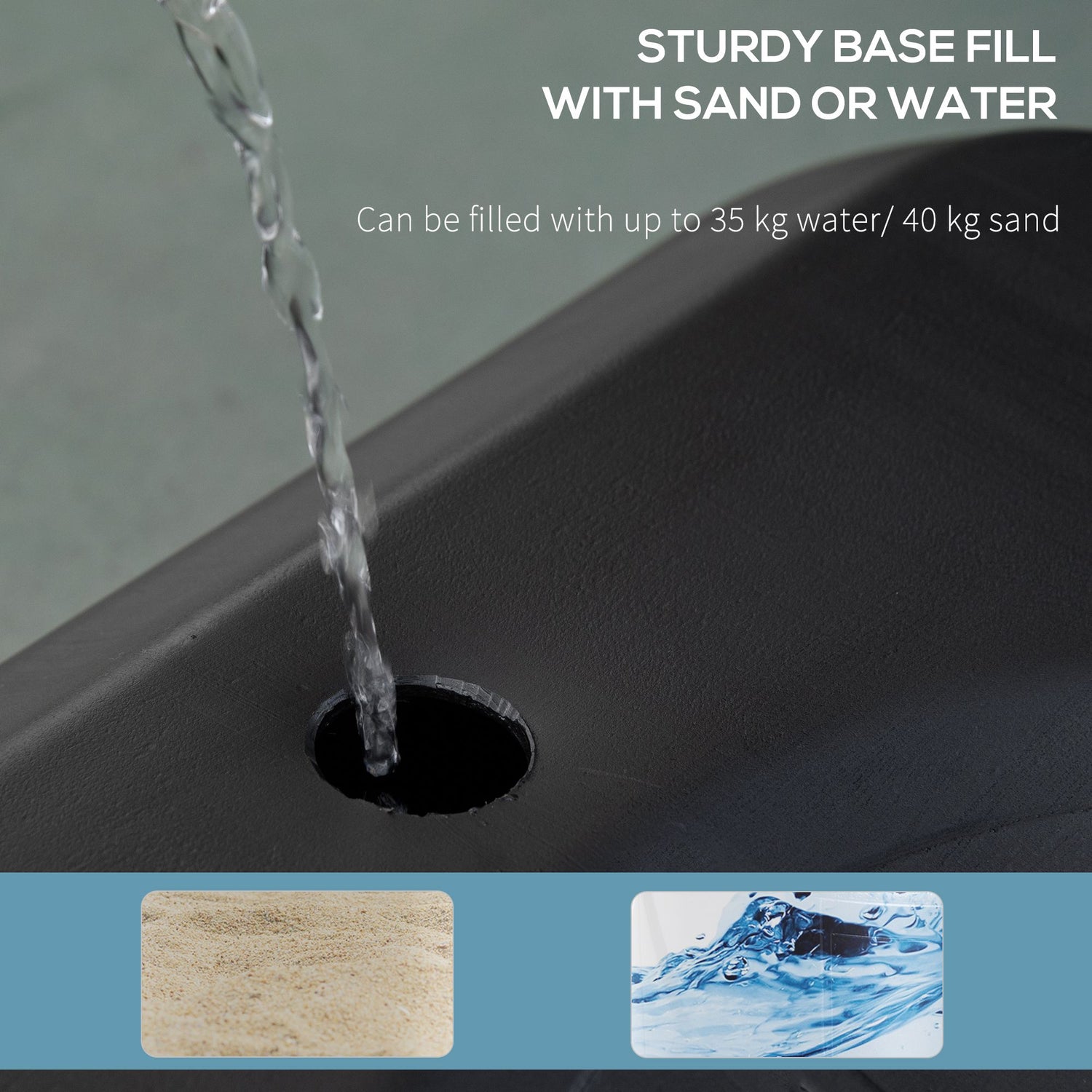 - Bottom base can be filled with 35kg of water, 40kg of sand or 45kg of water and sand, giving the base added stability