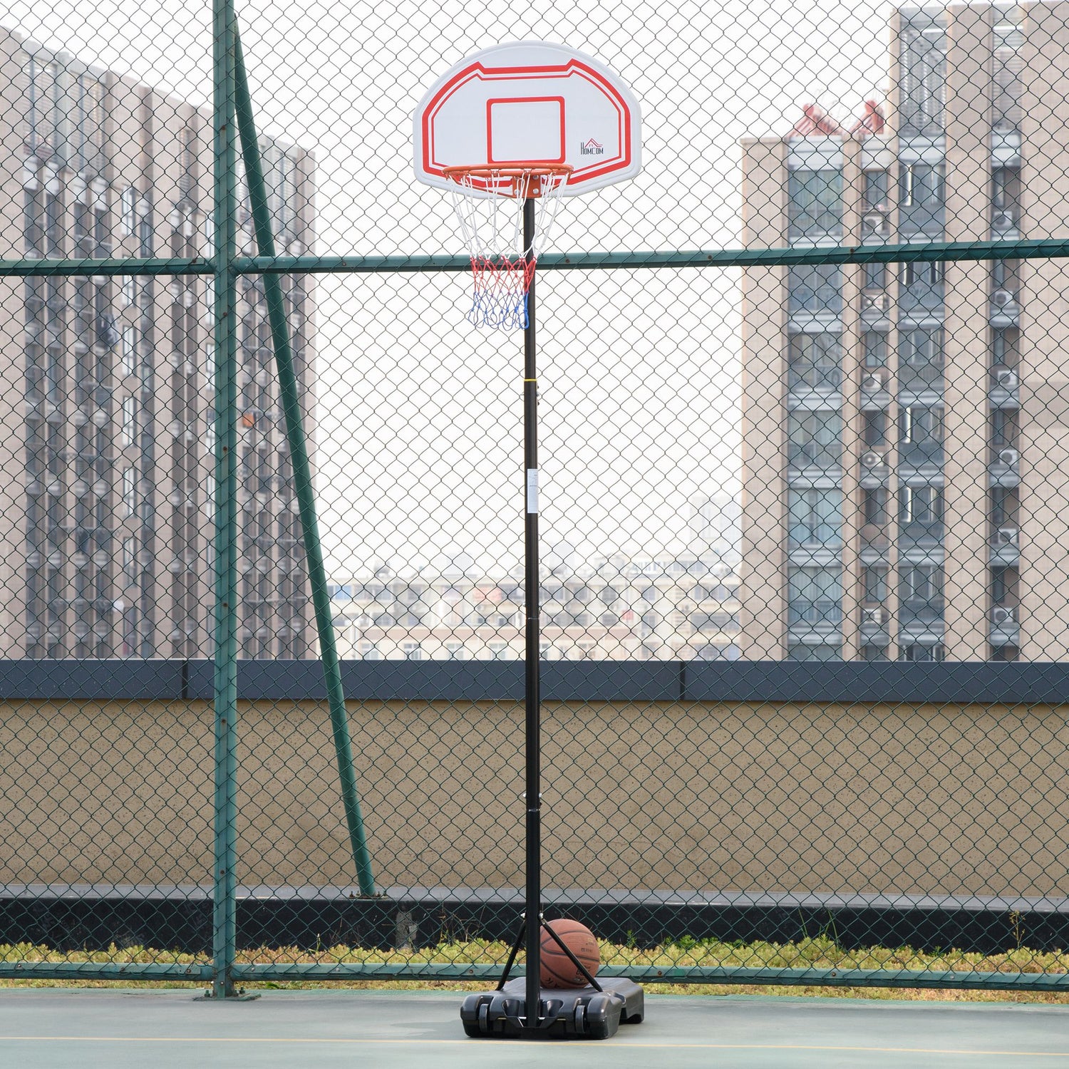 Enjoy shooting hoops with this HOMCOM basketball stand. With an adjustable height, it's suitable for all ages – everyone can join the fun. A steel frame for strength and durability, whilst the base can be filled with water or sand, keeping it firmly in place. Wheels at the bottom lets you move the stand with ease, so you can position it properly. Play on your own or with friends and family; either way, you'll enjoy the swooshing sound of the ball passing through the net.