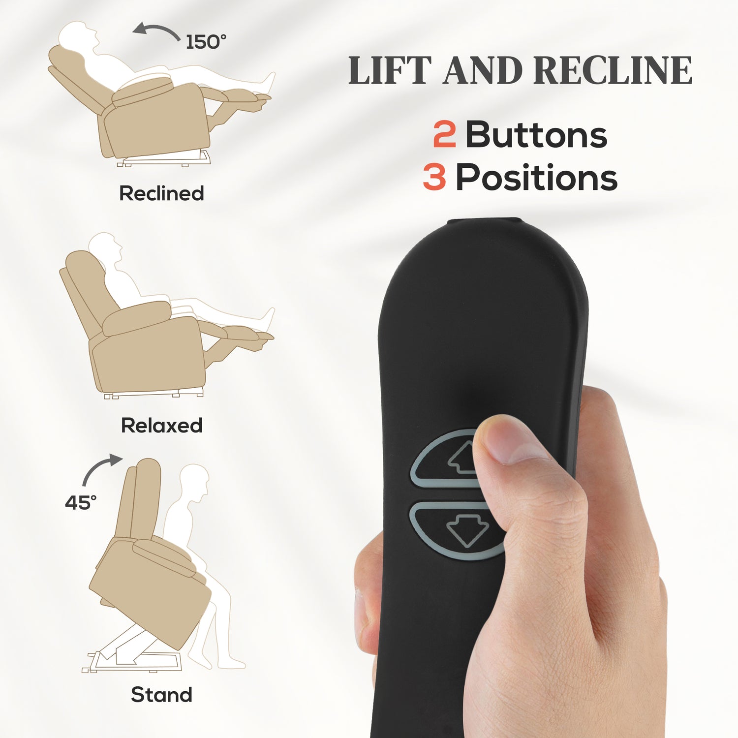 - Assisted standing and reclining: The reclining chair effortlessly lifts, aiding users into a standing position and reclines to any angel up to 150°, complete with a footrest, powered by effortless electricity.