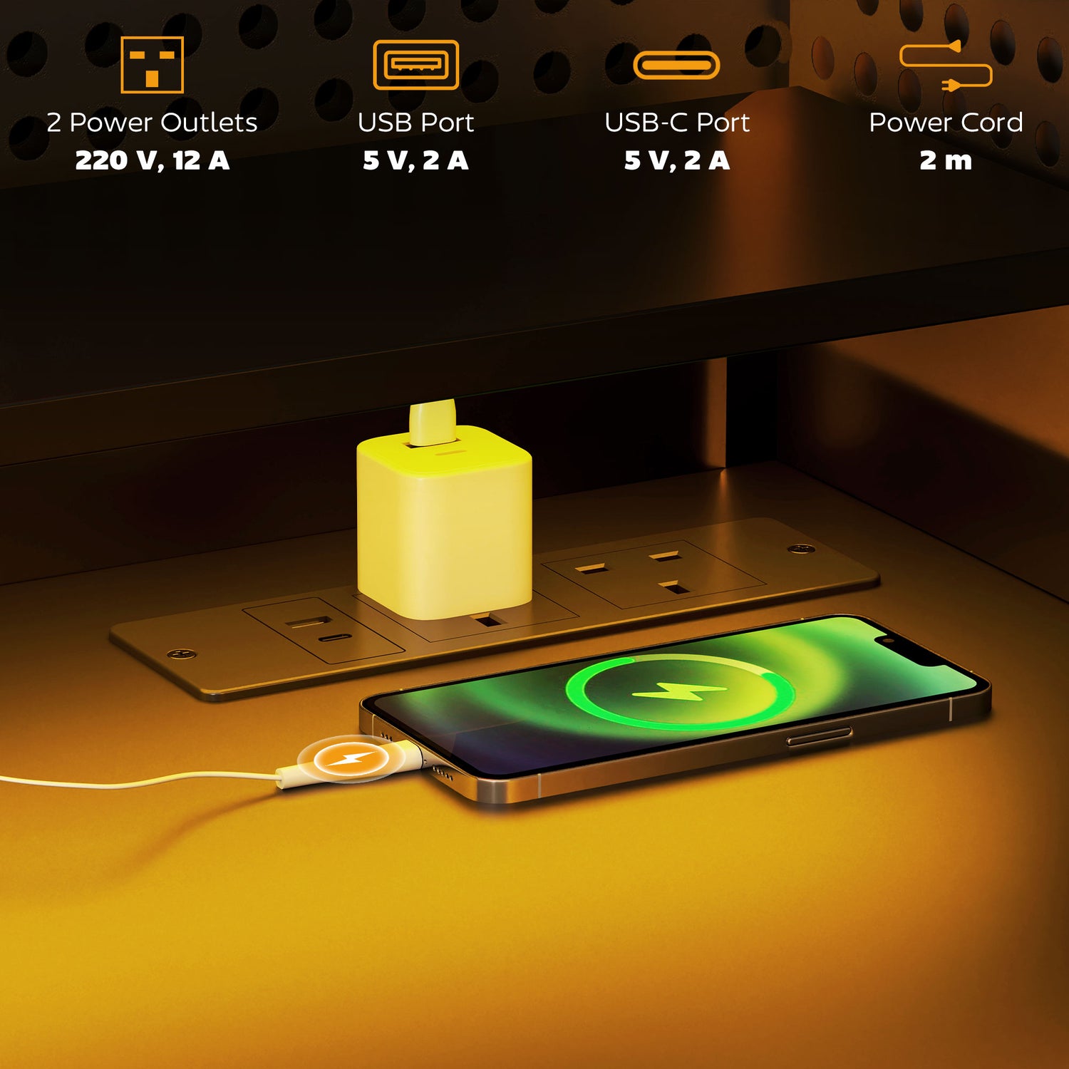 - Effortless charging solutions: Stay powered up with integrated charging hub on the office table, including two power outlets, a USB port, a USB-C port, completed with a 2 m power cord. Keep all your devices fully charged and ready to go without clutter