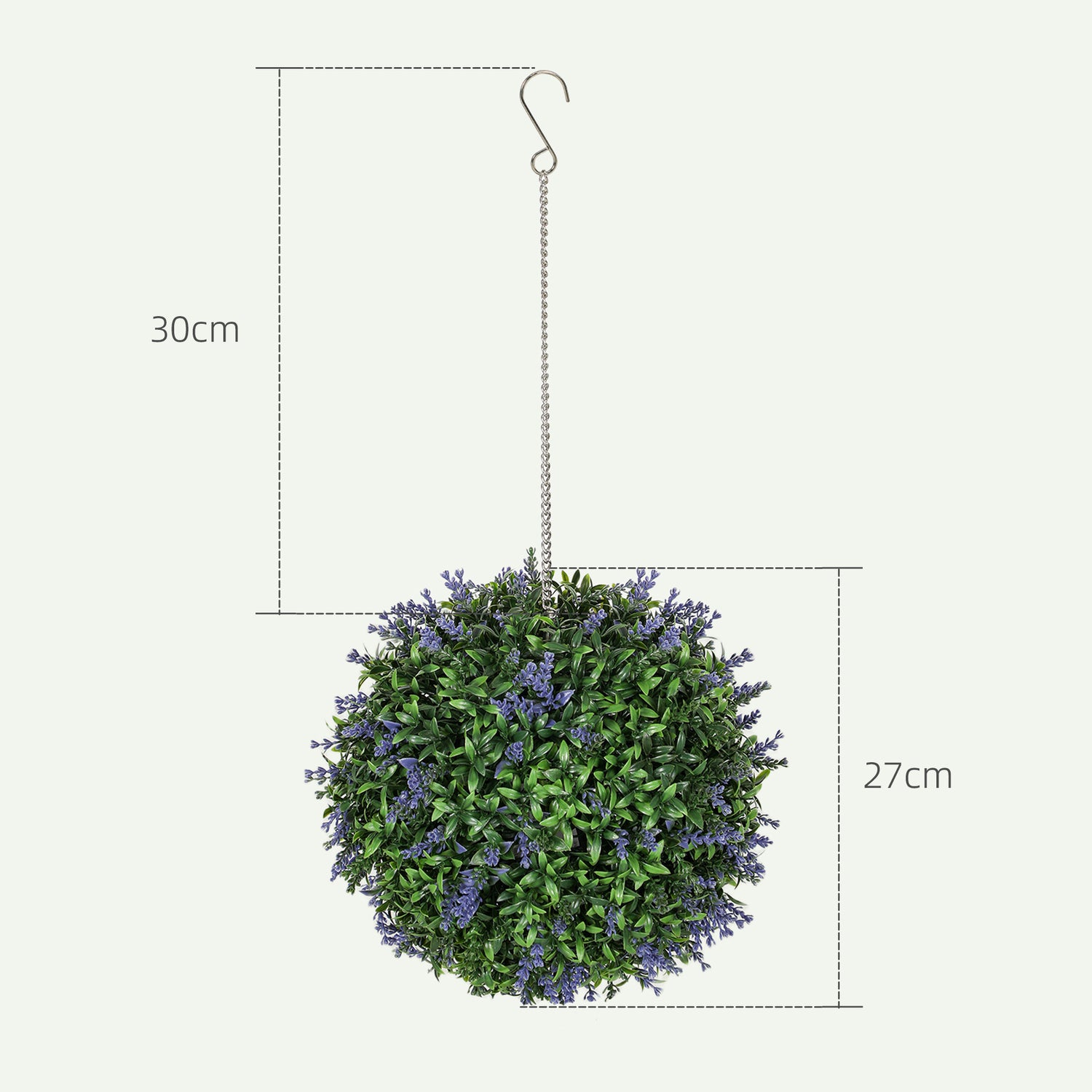 - The artificial plant topiary balls dimensions: Ø27cm. Easy to assemble by interlocking the buckles on each half. Two chains with hook and plastic ties included