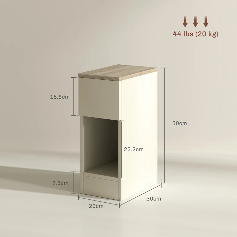 Thanks to the slim design of these two HOMCOM bedside tables, it's easy to maximise storage in your home and beyond. The simple design in white, with wood-effect tops makes these versatile pieces which work well in plenty of spaces, for plenty of different needs - bedside tables, side tables, or even as accent pieces. With a bottom shelf, drawer and flat top on both, there's also storage room to keep your space tidy and organised.