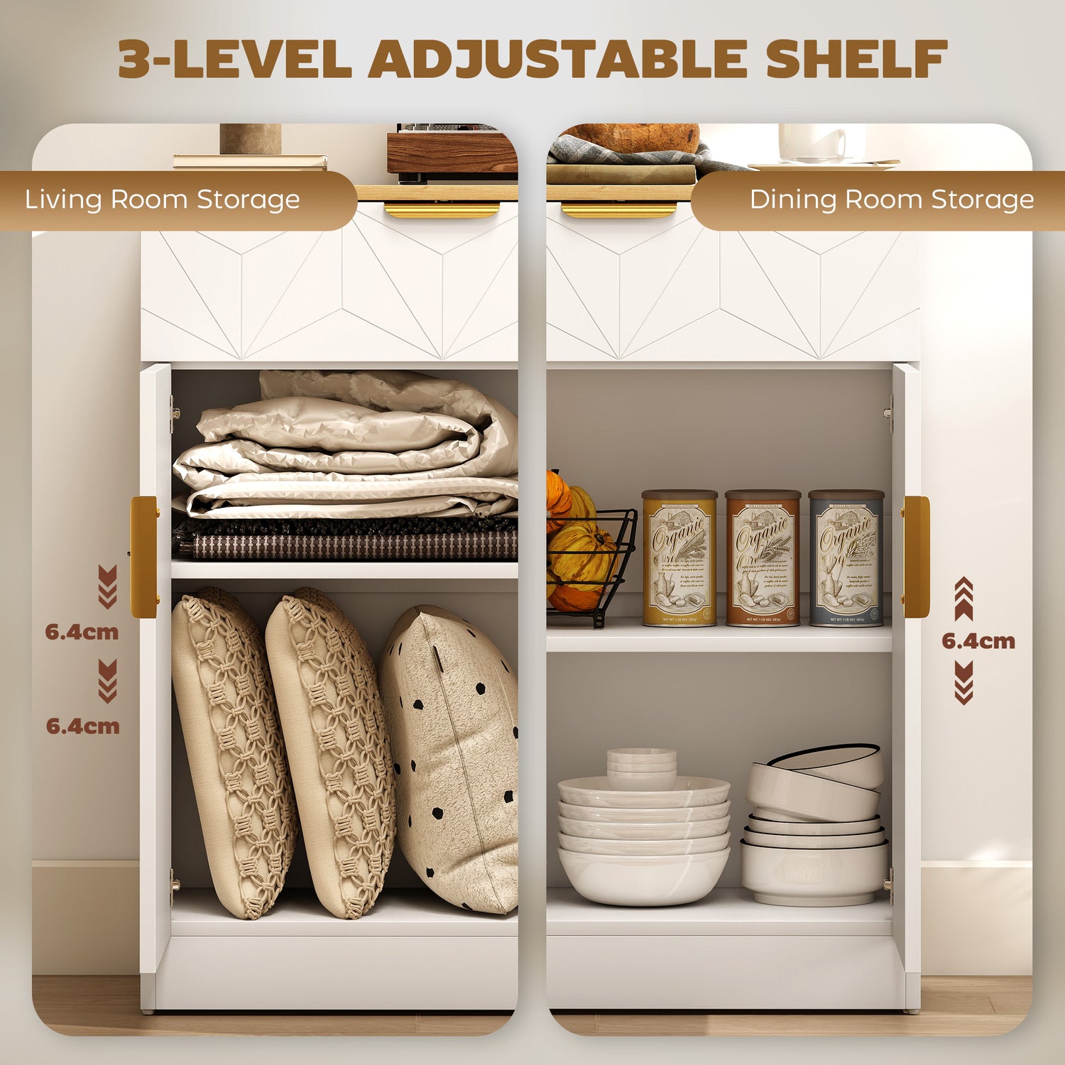 - Adjustable convenience: A three-level adjustable shelf inside the small sideboard makes it easy to organise books, electronics, or decorative pieces, helping keep your living room tidy and well-styled