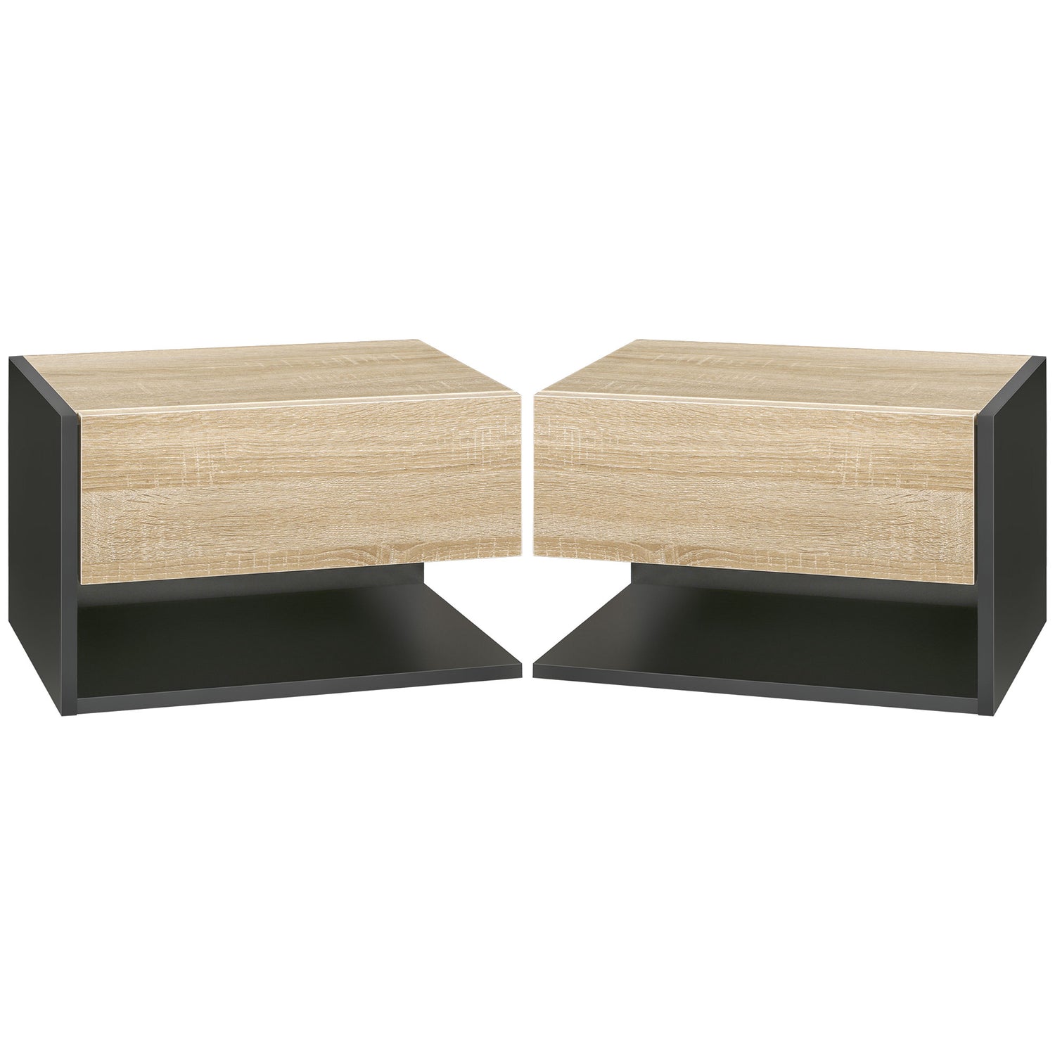 - Set of 2: Two stylish modern bedside tables featuring a chic contrast of black and oak wood colours, great for seamlessly enhancing your bedroom or guest room.