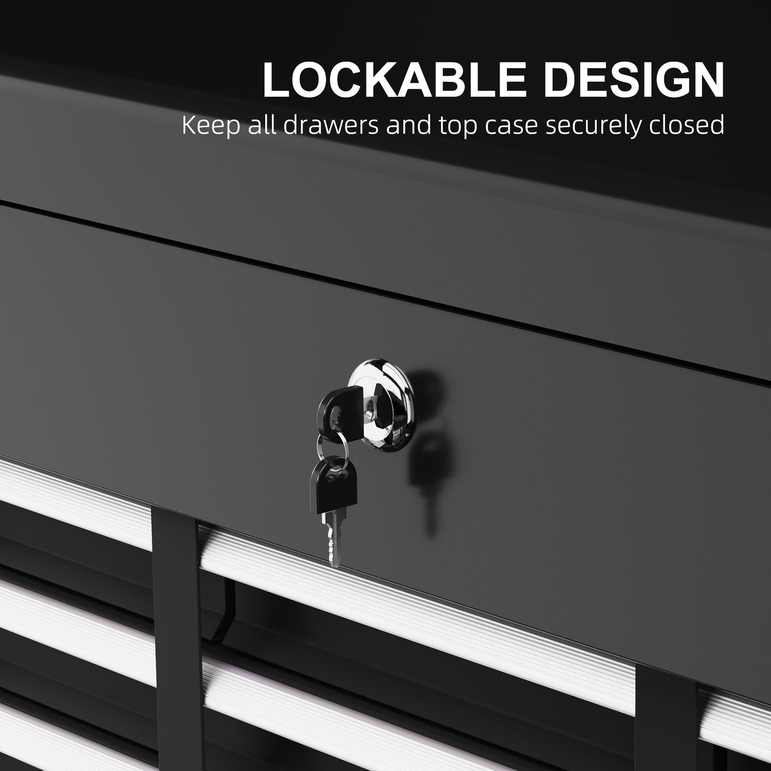 Discover tool storage convenience with this HOMCOM tool chest. This lockable tool box comes with six drawers and a top case, so there's plenty of room. Each storage space has an EVA mat to protect tools, and prevent them scratching the tool box shell. Made from powder coated steel, this is a strong, durable piece - made for daily jobs. A lockable design, for security, complete with a side handle to carry easily.